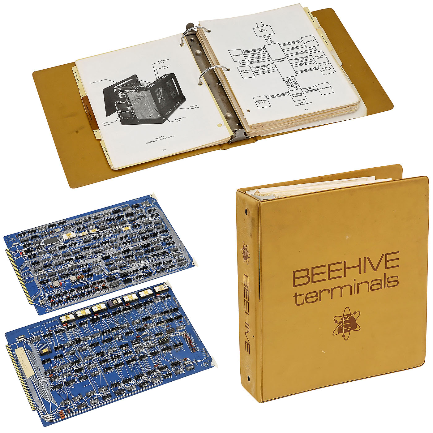 Beehive Medical Electronics, Inc., Salt Lake City, USA. 1) I/O processor board, 112-0329, with 7 programable 2048 bit chips, including Intel C1702A. – 2) Display Board, 112-0331, except Try State Multi-Plexer IC. – And: 3) Complete Super Bee maintenance manual package, with all manuals and parts lists.