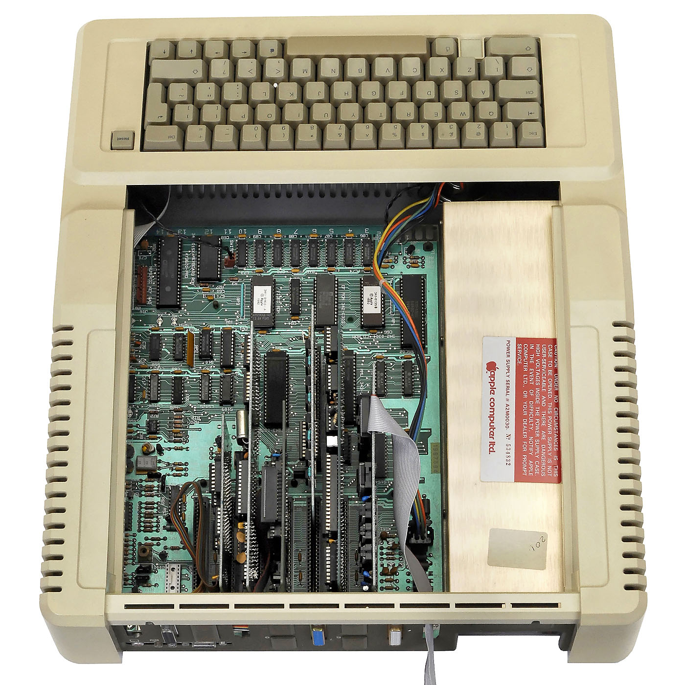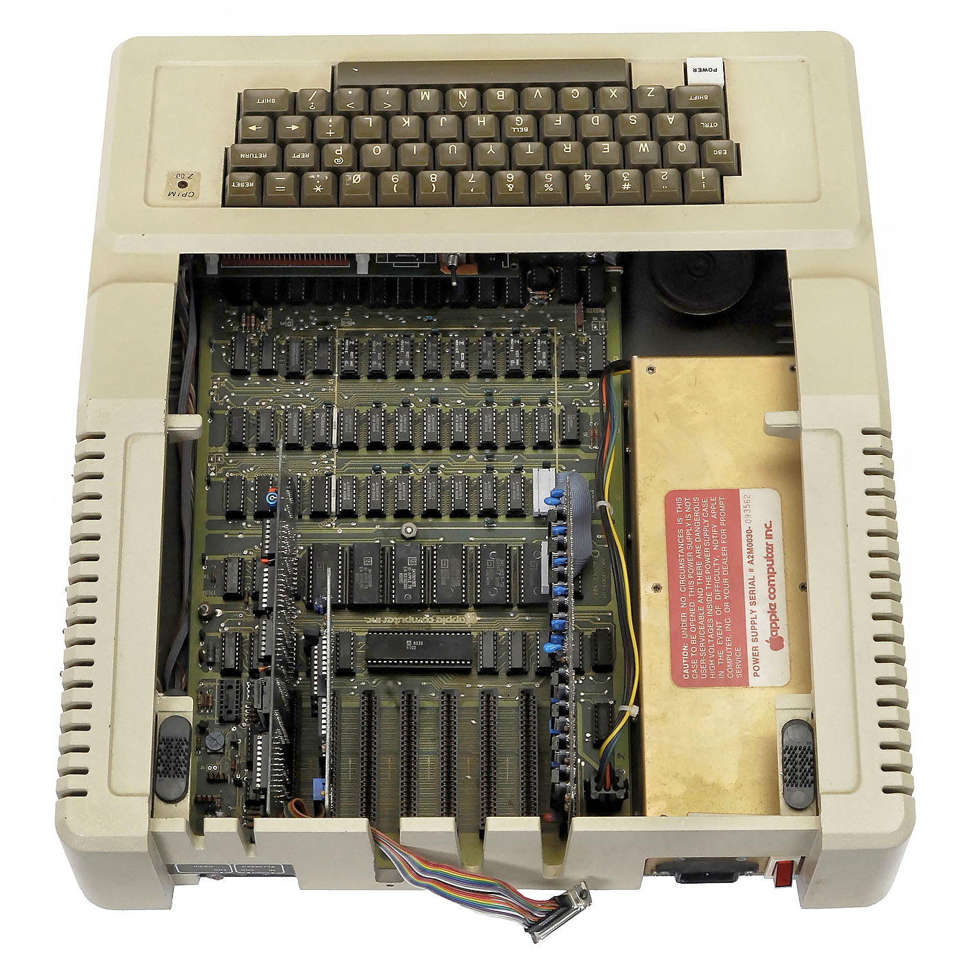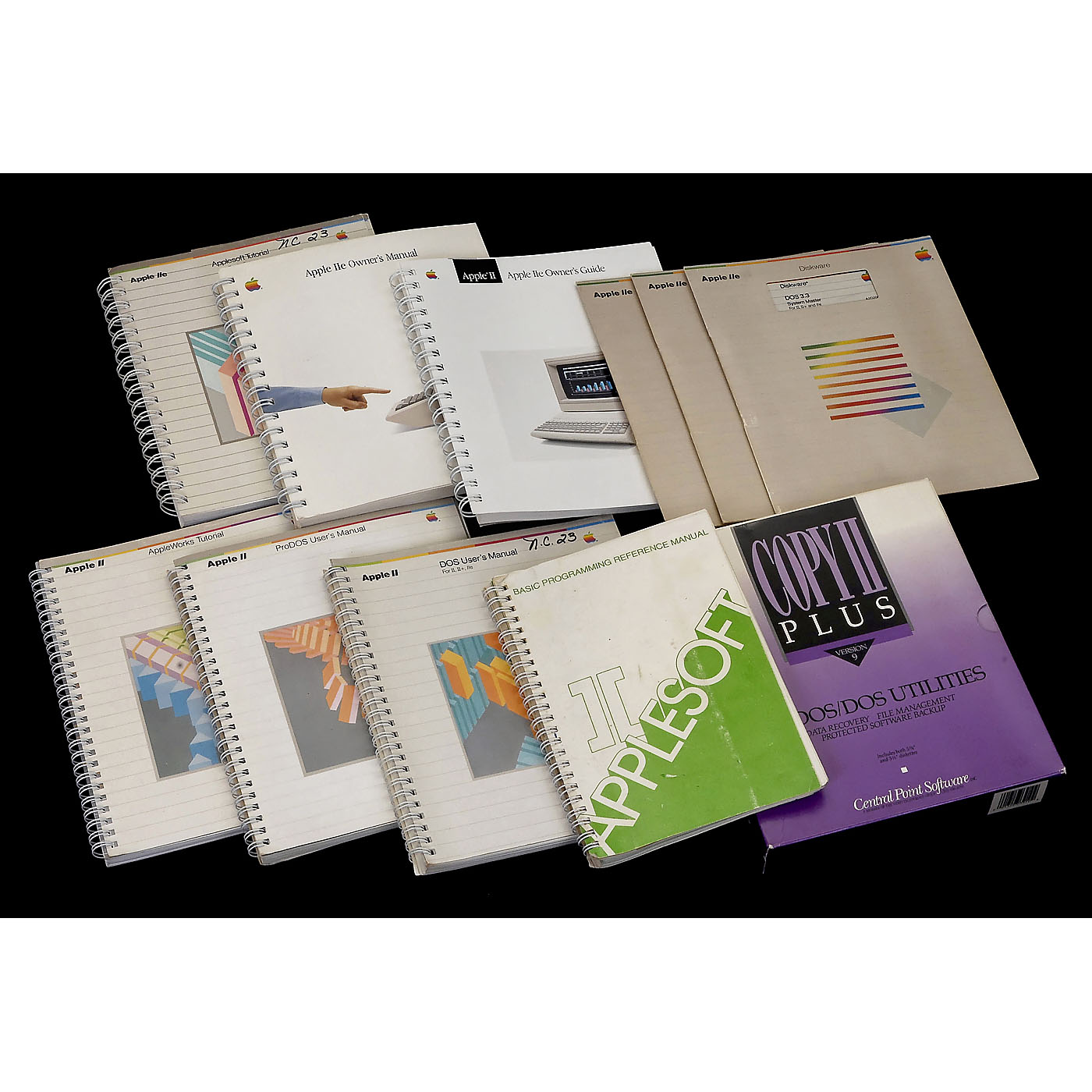 1) Apple II Europlus computer with 2 disk drives, 1978, made for the European market, 6502 processor, Apple 16K memory card, Apple 5,25" drive controller card, additional card with Z80 processor, some conversions with additional switches, 230 V, with 2 Apple A2M0003 5,25'' drives, 2 Apple hand controllers, approx. 80 floppy disks with programs (copies) and 4 "Apple II" manuals. – And: 2) Apple IIe computer, 1983, made for the European market, Rockwell R6502-40 processor, APL-B printer card, 80 row card, AIIE 80Col/64K memory-extension card, Parallel-Interface model 7720 card and Apple I/O controller card, 230 V, 3 Apple-IIe manuals, 3 original Apple 5,25" disks.