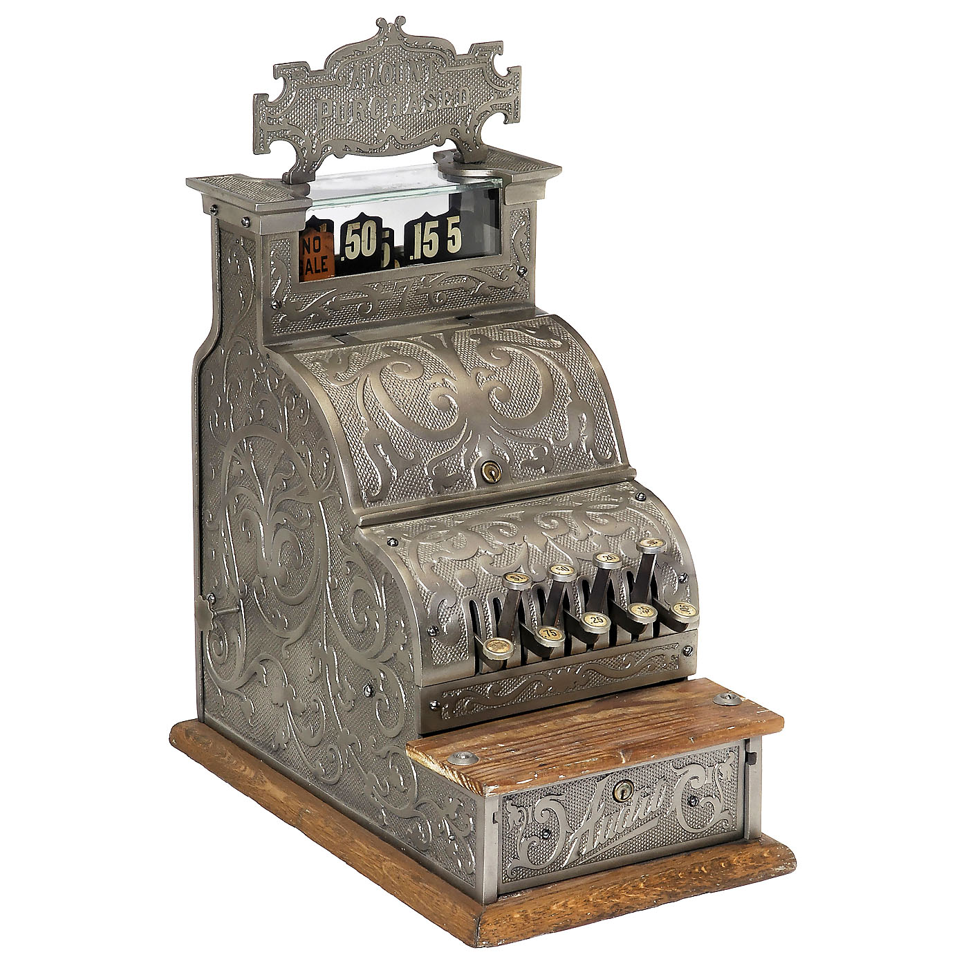 Nickel-plated, 9 push buttons, top sign with "Amount purchased" in relief, on oak plinth, mechanism sticks. – An extraordinary and decorative cash register.