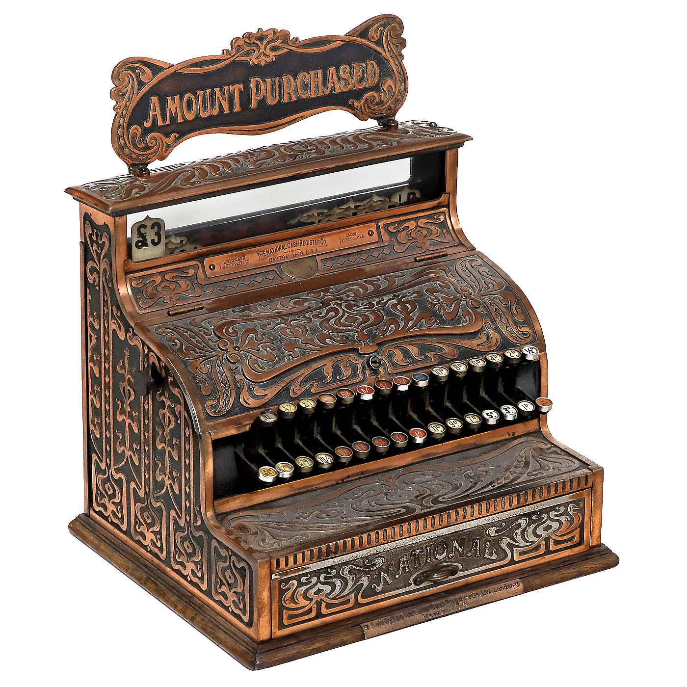 Model 140, made by The National Cash Register Company, Dayton, Ohio. Serial no. 642778, oxidized copper cast-iron case, double row of 31 push-down keys, amounts in British pounds and shillings, indicator tabs, cash drawer, mechanism partially sticking.