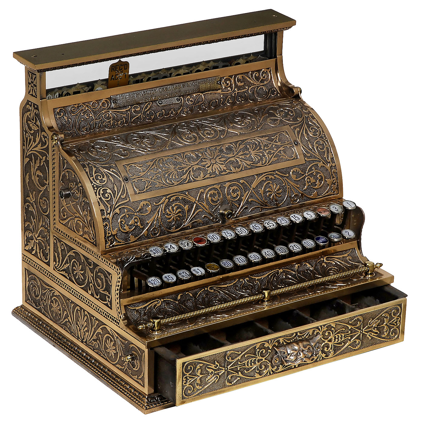 Serial no. 33363, manufacturer: National Cash Register Company, Dayton, Ohio. 30 amount keys in 2 rows, for American currency, total adder, bronze case, shipped on September 17. 1891, working, good restored condition. With rare signature scroll legend "National Cash Register Co."