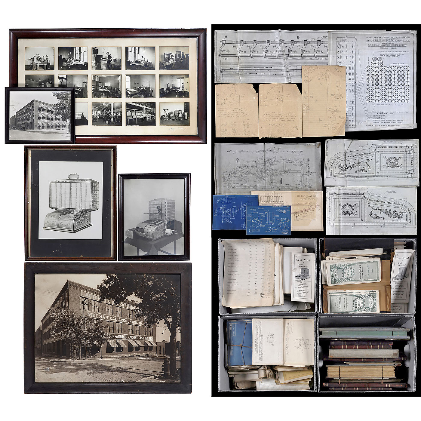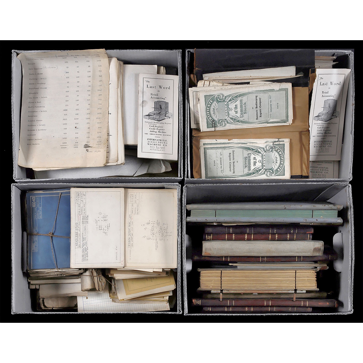 Pictures, drawings, technical documents and more. 1) Cash register photo, 24 x 34 in. – 2) Large-format factory photo, 46 x 36 in. – 3) Series of 15 pictures, production rooms and offices, together in frame, 64 x 37 in. – 4) 2 pictures, each 23 x 18 ½ in. – 5) Box with cash and pay books. – 6) Share certificates and list of shareholders. – 7) Box with contracts and important documents. – 8) Box with drawings of small parts. – 9) Box with approx. 500 original brochures. – 10) 4 folders with certificates. – And: 11) Portfolio with approx. 300 drawings and blueprints. – A very interesting insight into American company history. – Not all pictured. Please not: Due to the size of the frames, shipping is very expensive.