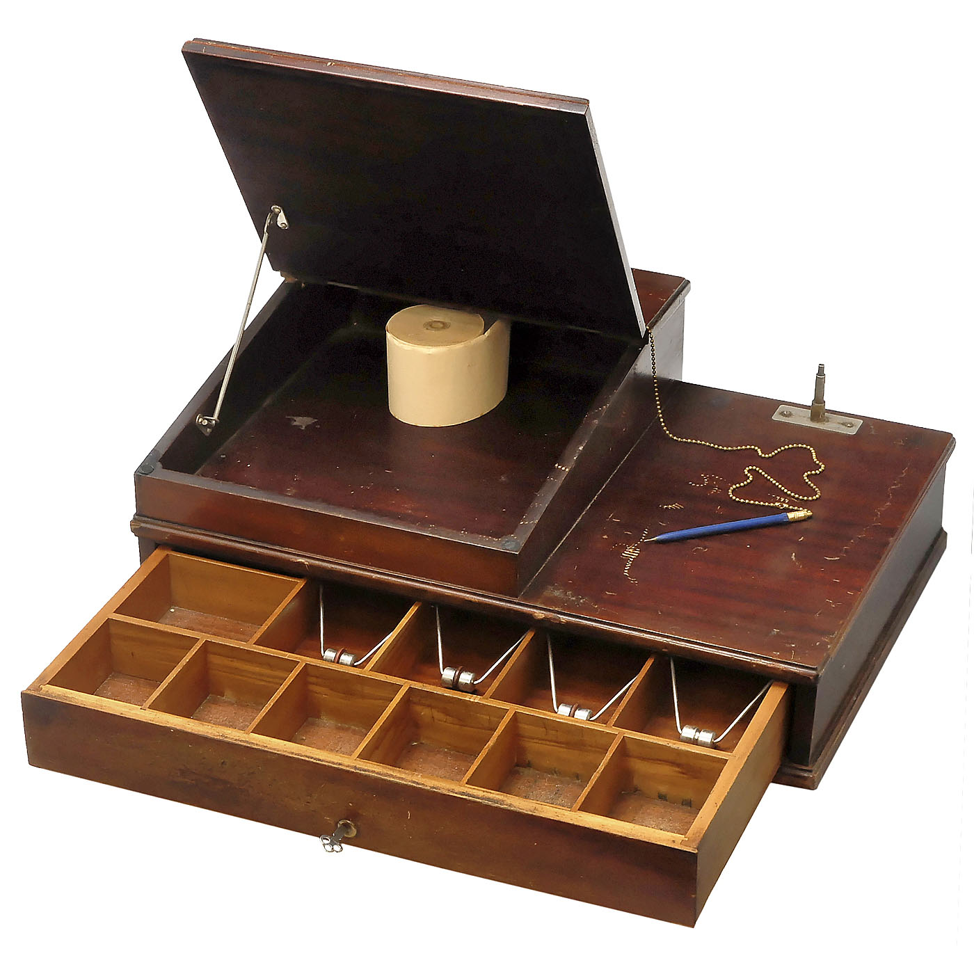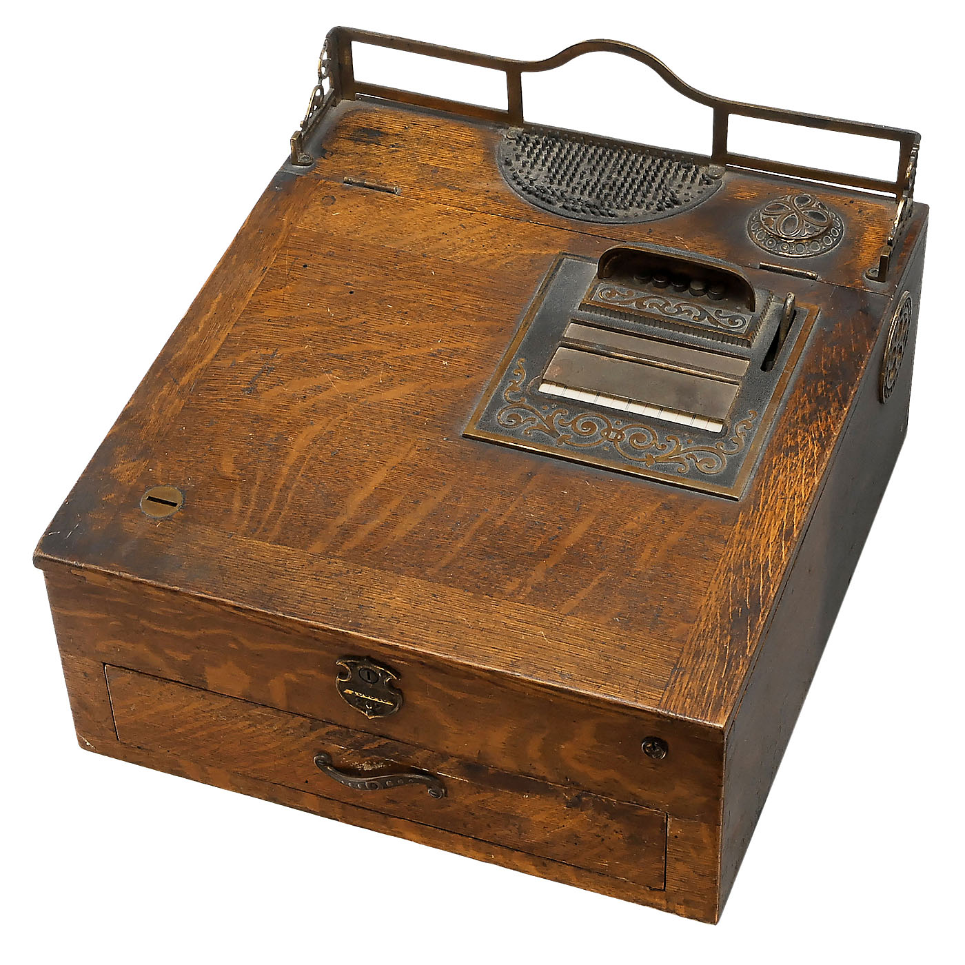 1) The Sundstrand Speed Cash Register, c. 1890, wood, writing desk with storage compartment, money drawer, with bell and key, 23 ½ x 15 ¾ x 9 in. – And: 2) National cash drawer model 202, 1893, National Cash Register Company, Dayton, USA. Serial no. 190843, oak and brass, with paper strip, inkwell compartment and cash drawer, size 17 1/3 x 19 x 12 ¼ in.