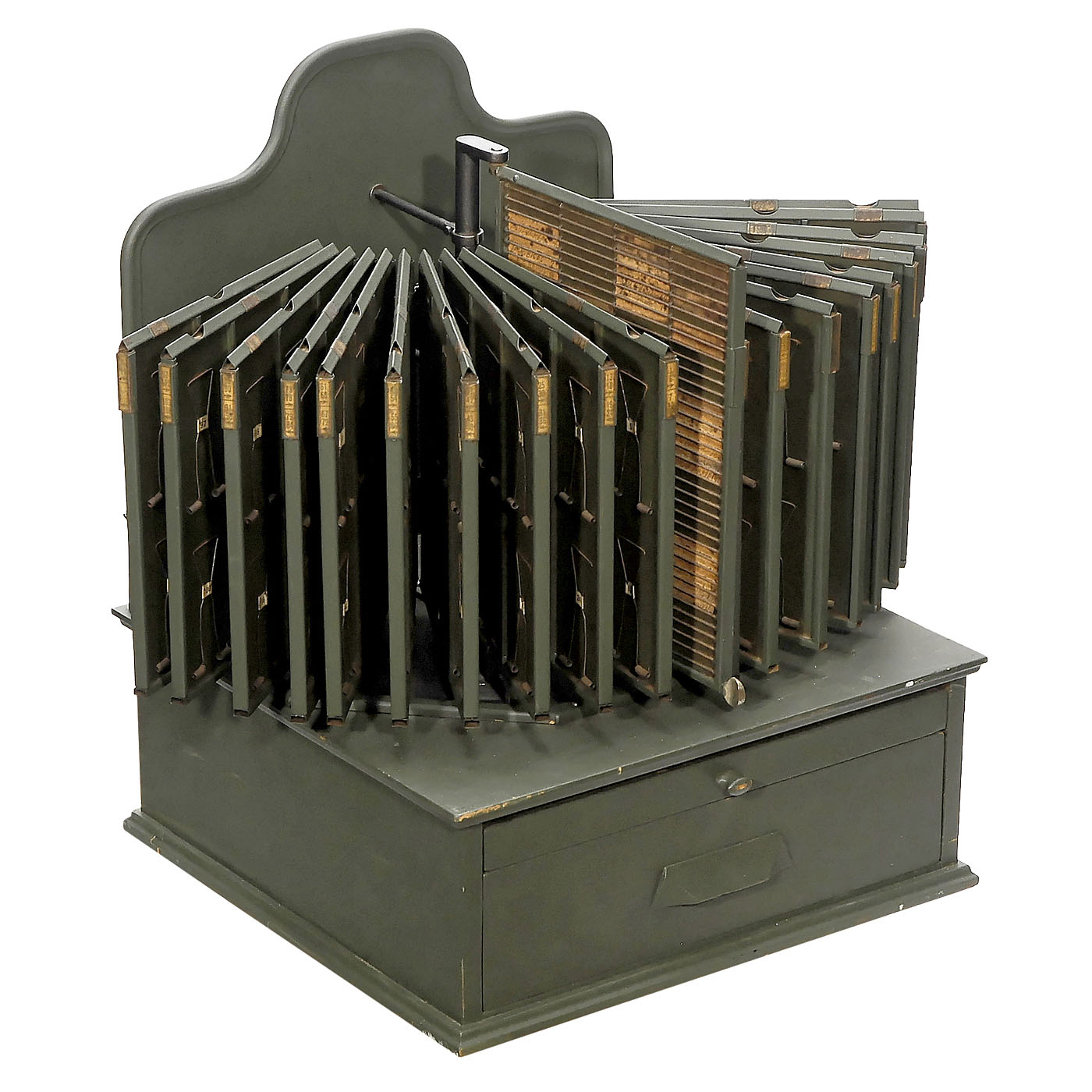 1) National Cash Register Company Receipt Cabinet, c. 1900. Oak cabinet with lower drawer, 100 compartments, plate on top "The National Cash Register Co. Dayton, Ohio U.S.A.", measuring 21 ¼ x 13 1/3 x 25 3/5 in. – 2) McCaskey Register Company File Cabinet, c. 1900, McCaskey Register Co., Alliance, Ohio, USA. Metal top with 20 swiveling invoice holders, wood base with 2 drawers for file cards, size 23 x 21 2/3 x 28 1/3 in. – 3) Victor Tube Index, turnable desktop stand for addresses and telephone numbers, c. 1925. – 4) The Simple Account Salesbook Register. – And: 5) "Kardex Cabinet", with 7 drawers.
