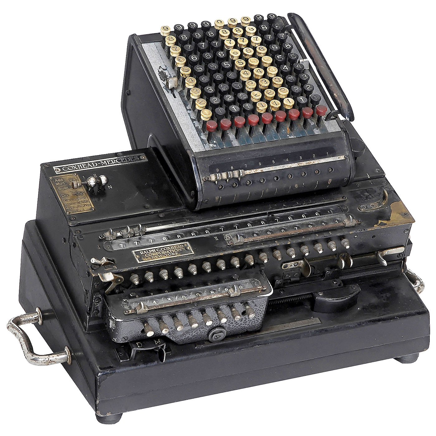 Model 8, American dealer's plaque "Ralph C. Coxhead Corporation, New York", proportional lever mechanism, invented by Christel Hamann, full keyboard, 16-digit main counter, 110 V, electric functions untested. – The first fully automatic four-species operating calculator.