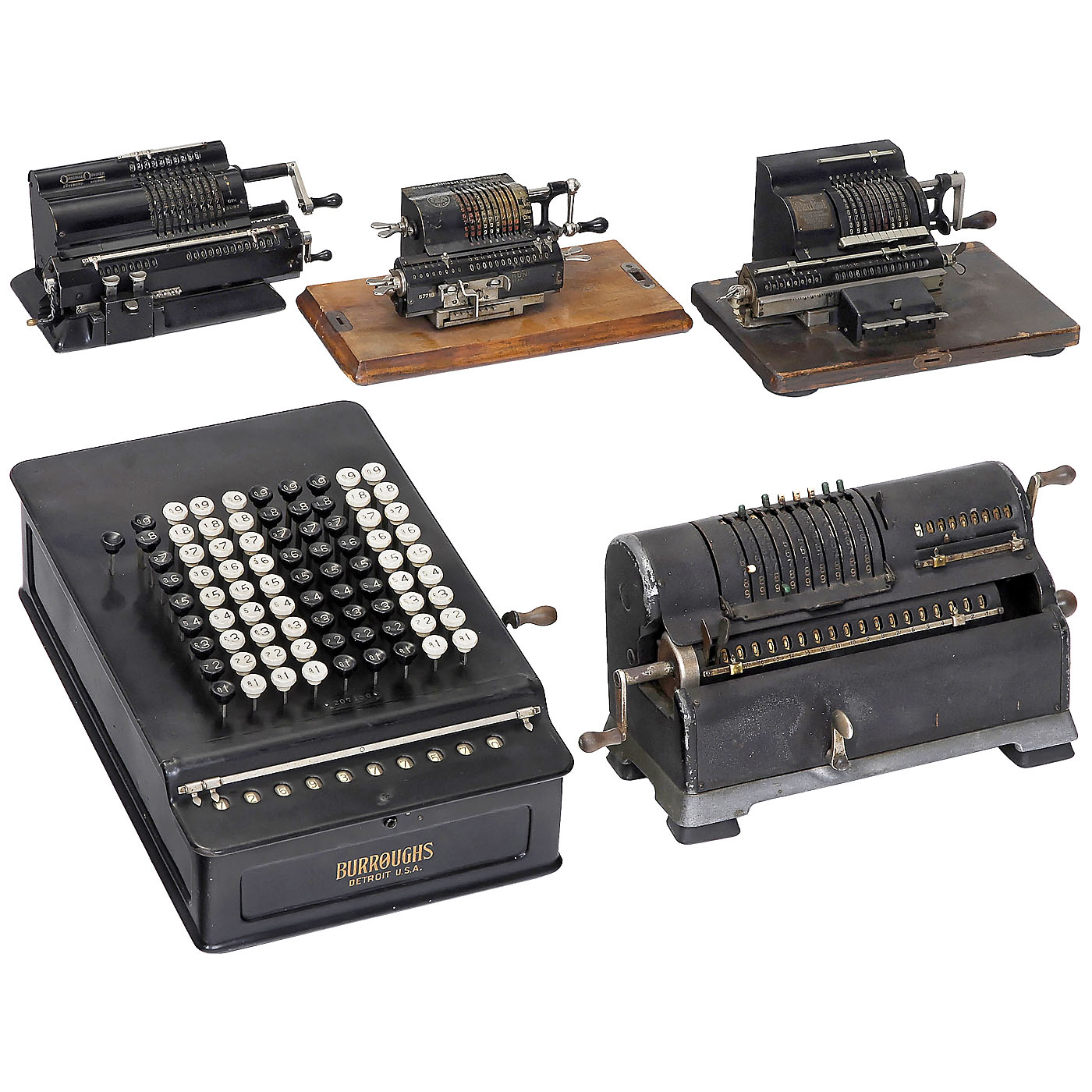 1) "Brunsviga Midget", c. 1920, made by Grimme & Natalis, Braunschweig, Germany. Serial no. 67718, spoked-wheel machine, 9, 8 and 13 digits, marked "Midget" for the American market, working. (2–3/2) – 2) "Marchant Pony Model A", c. 1915, no. 941, USA, spoked-wheel machine, mechanism partially sticking. (2–3/3–4) – 3) "Marchant XL", c. 1925, no. 96255, adaptive segment mechanism, working, mechanism a bit stiff. (3/3) – 4) "Burroughs Model 520", c. 1912, no. 207150, construction similar to the Comptometer, reset lever loose. (2–3/3–4) – And: 5) "Original-Odhner 39", c. 1940, no. 288319, spoke-wheel machine, mechanism sticks. (3/4)