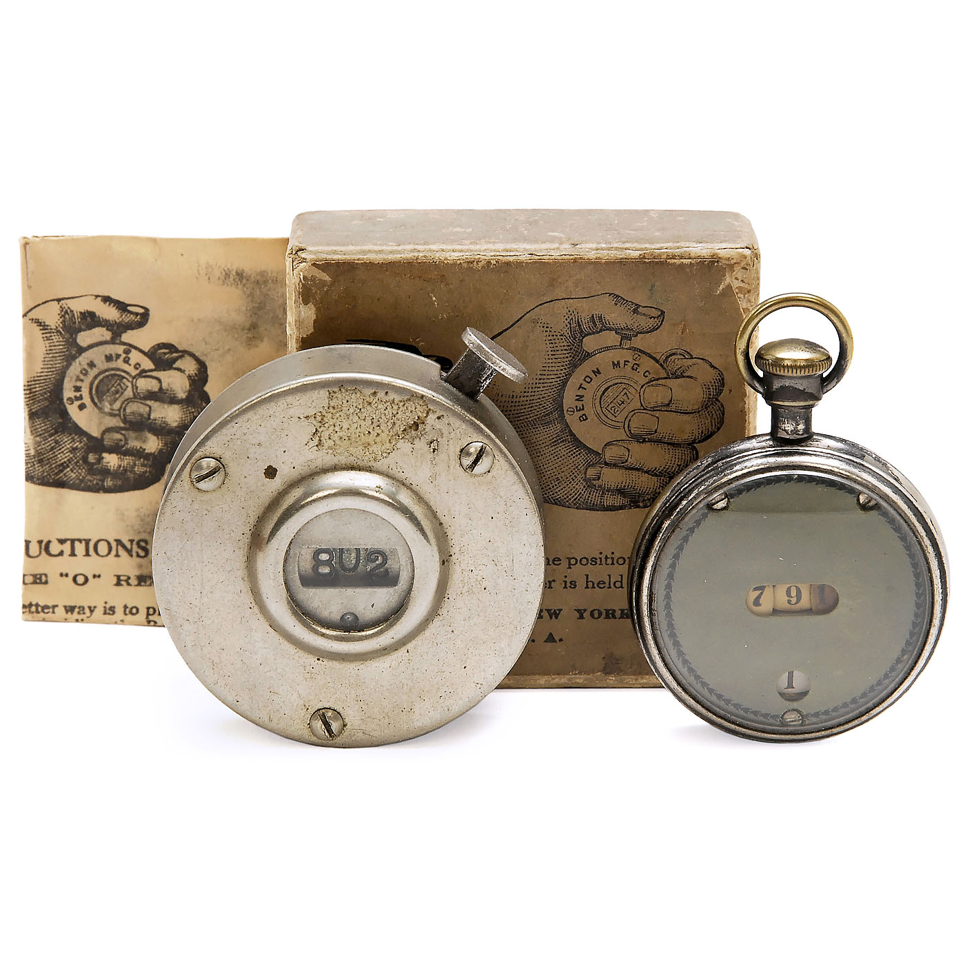 1) Unmarked, c. 1890, silver case in pocket watch shape, 3 digits, Ø 1 ½ in. – And: 2) Benton Mfg. Co., New York. The "O" Register, c. 1920, 3 digits, with reset function, nickeled case, Ø 2 in., with manual, in original box.