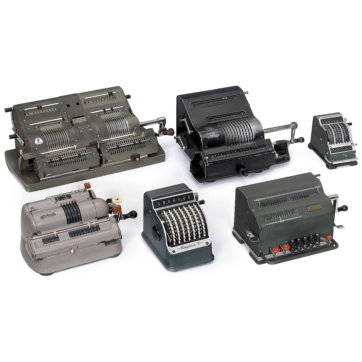 1) Twin-Brunsviga Mod. D 13 R-1, c. 1960, serial no. 291798, rare duplex machine for special calculations in surveying and science, 2 x 10, 2 x 8 and 2 x 18 digits, working, missing two small wheels. (3/3–4) – 2) Walther WSR 110, c. 1956, 6, 6 and 11 digits, working. (3/2) – 3) Facit, c. 1950, 10-digit keyboard, working, but a bit stiff. (2–3/3) – 4) Nova Brunsviga IVa, c. 1930, serial no. 126370, 10, 10 and 18 digits, working. (2–3/2) – 5) Regina 7, mechanism sticks. (2–3/4) – And: 6) Resulta BS-7, toothed wheel adder, working. (2–3/2–3)