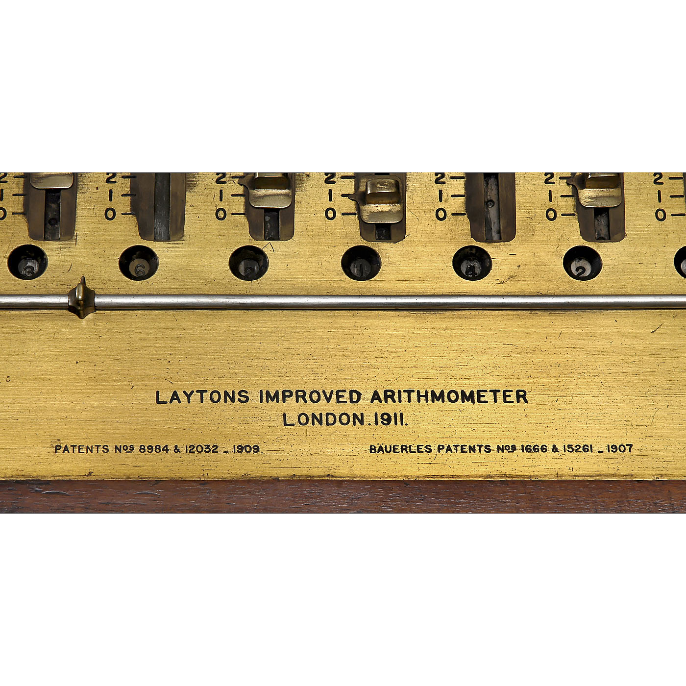 Rare English brass stepped-drum arithmometer with interesting patent dates from 1909 and link to Matth. Bäuerle's patents of 1907, with 8, 9 and 16 digits, mahogany case, serial no. 1520. – Literature: Martin, p. 91. – Extremely rare collector's item! Working.