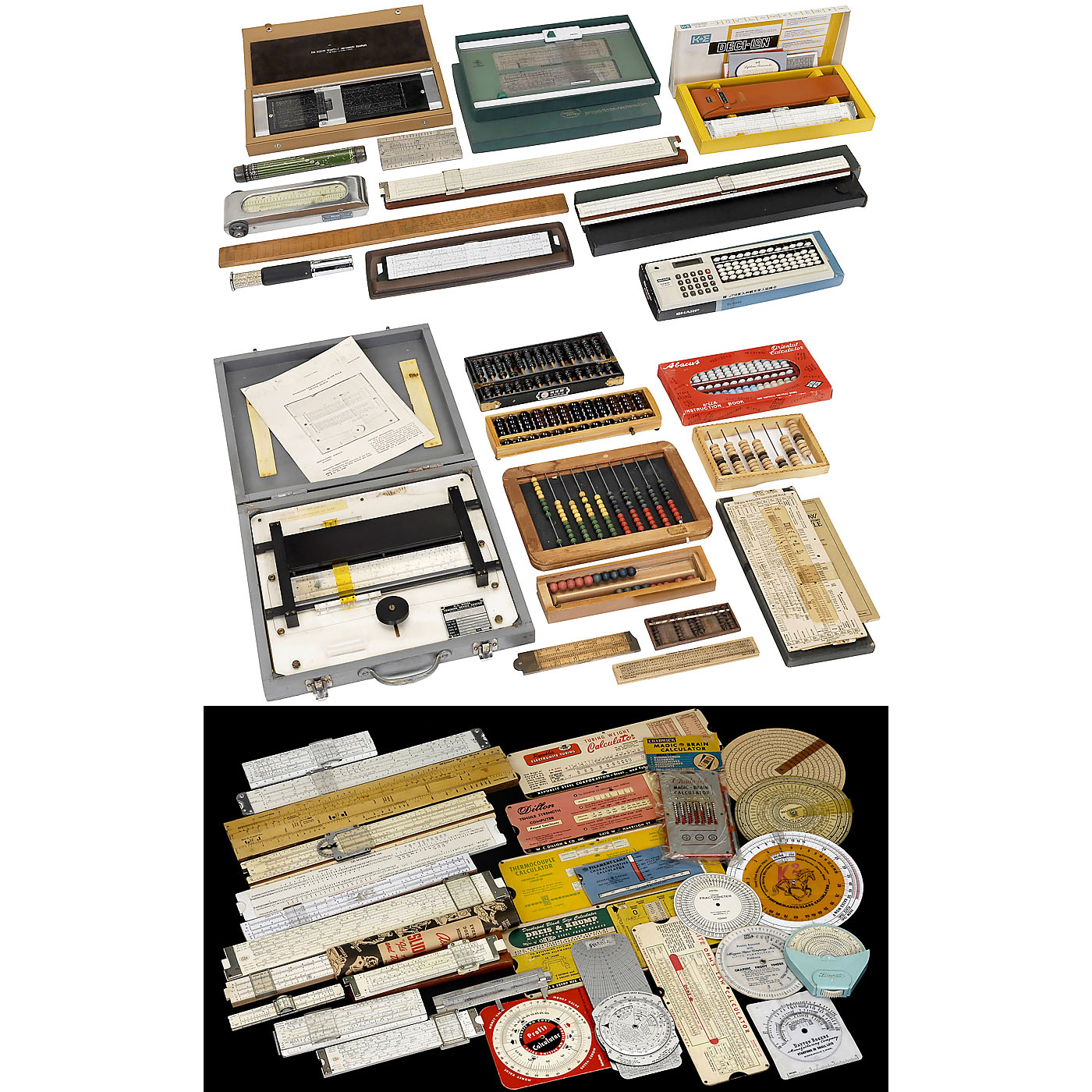 1) "Animated Transparency Slide Rule", U.S. Naval Training Device Center, for overhead projection, 1958. – 2) "Otis King's Pocket Calculator", c. 1930, logarithmic pocket drum calculator. – 3) "Gerber Graph analogue" model GA-103, with variable scale. – 4) "Darnley's Patent Rotatable Lightning Calculator", England. – 5) 4 slide rule pens: "Roller Rule", "Magic Multiplying Pencil", "Chicago Recording Scale" and "Nicolet Slide Rule Pencil". – 6) "Faber-Castell Projektions-Rechenstab", model 310/87, c. 1965. – 7) "Corona" lighter with slide rule, Japan, c. 1970. – 8) 20 slide rules, including Keuffel & Esser desk model and 2 Keuffel & Esser large-size models, length each 22 in. – 9) "Paisley Calculator", model A, USA, c. 1940. – 10) 8 abaci, including Sharp EL-8048, with electronic calculator. – 11) 17 disk adders and simple calculating devices. – 12) 3 boxwood measuring bars. – And: 13) "Lawrence Secret Code Maker".