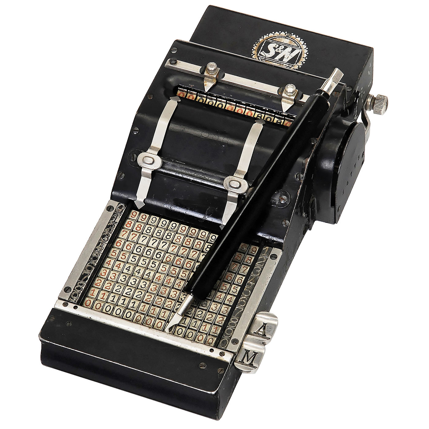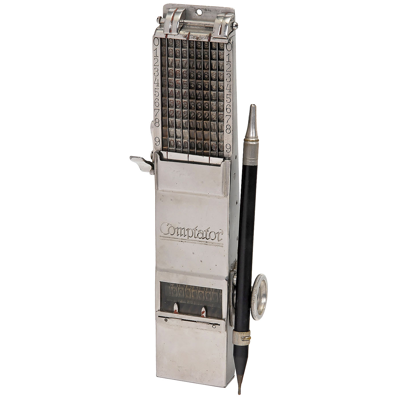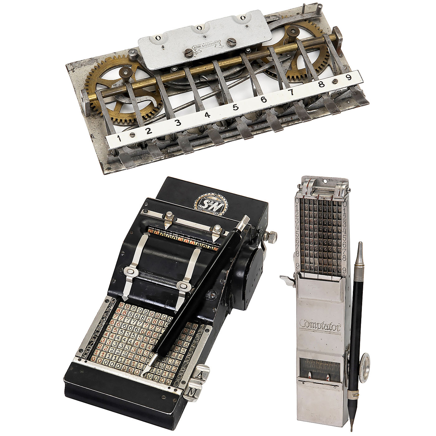 3 mechanical calculators. 1) "Adix Mod. 4", 1903 onwards, attractive 3-digit adding machine with 9 keys and release lever by Pallweber & Bordt, Mannheim, Germany. In original velvet-lined case. – Literature: Martin, p. 144. – Very sought-after collector's item! – 2) "Comptator", c. 1910, pocket chain-adder by Hans Sabielny, made by Schubert & Salzer, Chemnitz, Germany. 9 digits, with pen in box. – Literature: Martin, p. 231. – And: 3) "SuN", 1910 onwards, by Seidel & Naumann, Dresden, rare German 13-digit chain-adder with pen, original case, serial no. 14778.