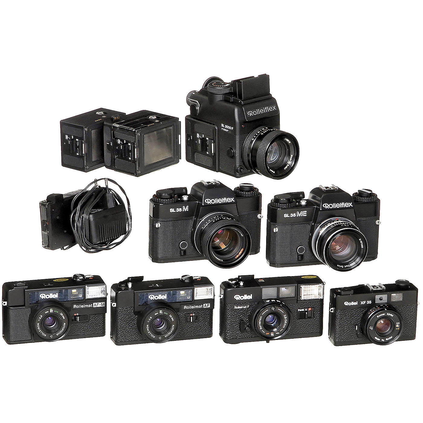 Rollei, Braunschweig. 1) SL 2000 F, 1980, no. 723510226, Rollei HFT Planar 1,8/50 mm, with 3 magazines and 2 battery packs. – 2) Rolleiflex SL35 M, no. 4714914, Rollei HFT Planar 1,4/50 mm. – 3) Rolleiflex SL35 ME, no. 4902189, Planar 1,8/50 mm. – And: 4–7) 4 Rollei 35mm cameras: Rollei XF35 with Sonnar 2,3/40 mm, Rolleimat F, Rolleimat AF and Rolleimat AF-M. – Very good condition but not tested.