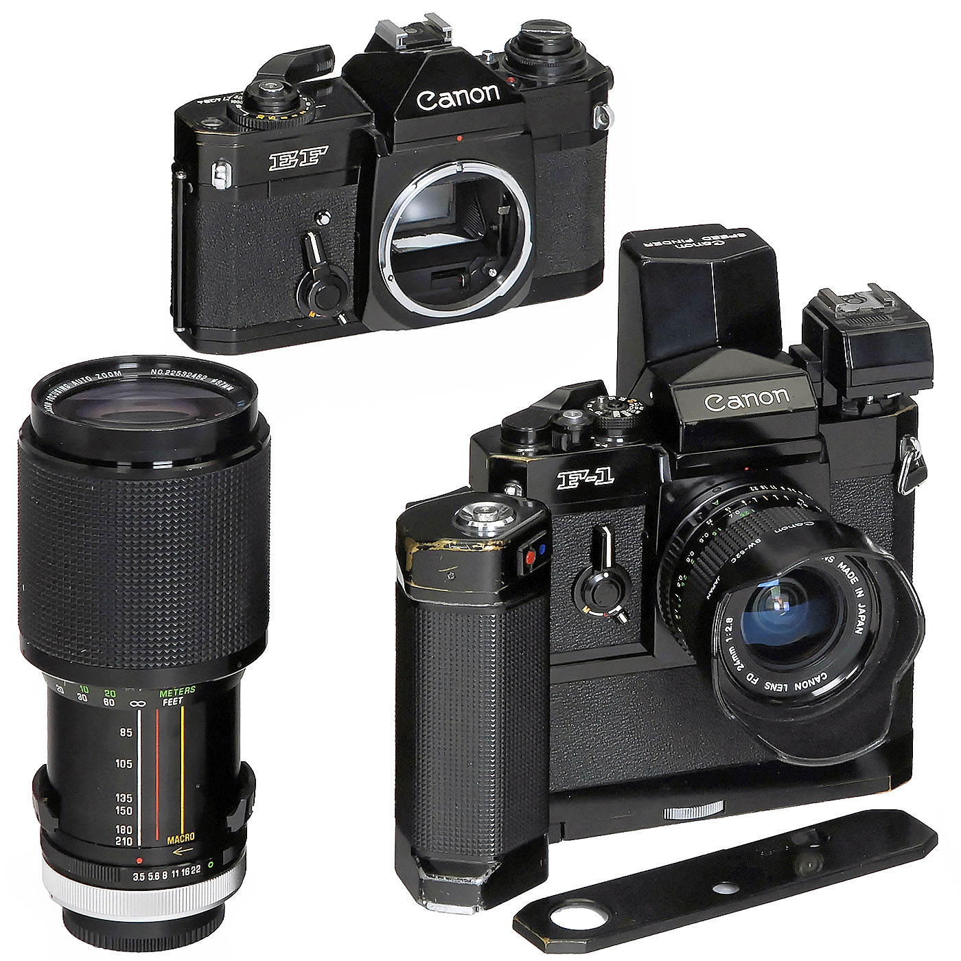 Canon, Japan. 1) Canon F-1, no. 668419, shutter working, exposure meter not tested. (2–3/3) – With Speed Finder (2/2) and Motor Drive MF, no. 43005, some oxidation in battery holder, working! (3-/3) – With untested Flash Coupler L as well as standard F-1 ground plate without battery cap. Canon's workhorse of the 1970s. – 2) Canon EF, no. 274294, shutter working, exposure meter not tested, small dent on prism. (3/3) – 3) Canon FD 2,8/24 mm with BW-52C sunshade. (2/2) – And: 4) Vivitar Series 1 Zoom 3,5/70–210 mm. (3/3)