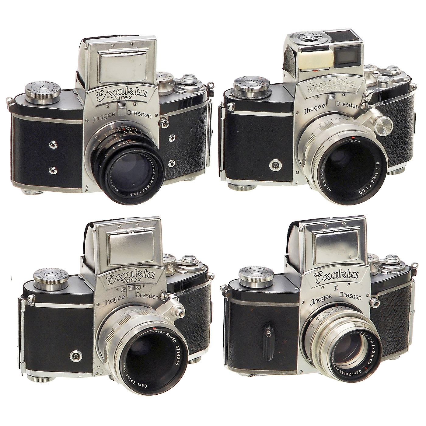 Ihagee, Dresden. 1) Exakta II, 1949, no. 661135, Biotar 2/5,8 cm T, no. 2825389. – 2) Exakta Varex, c. 1950, no. 676977, black Biotar 2/5,8 cm T, no. 3421788. – 3) Exakta Varex VX, 1954, no. 631974, Tessar 2,8/50 mm, no. 4774318. – And: 4) Exakta Varex IIa, 1957, no. 860936, T 2,8/50 mm, no. 4642282. With cell prism finder.