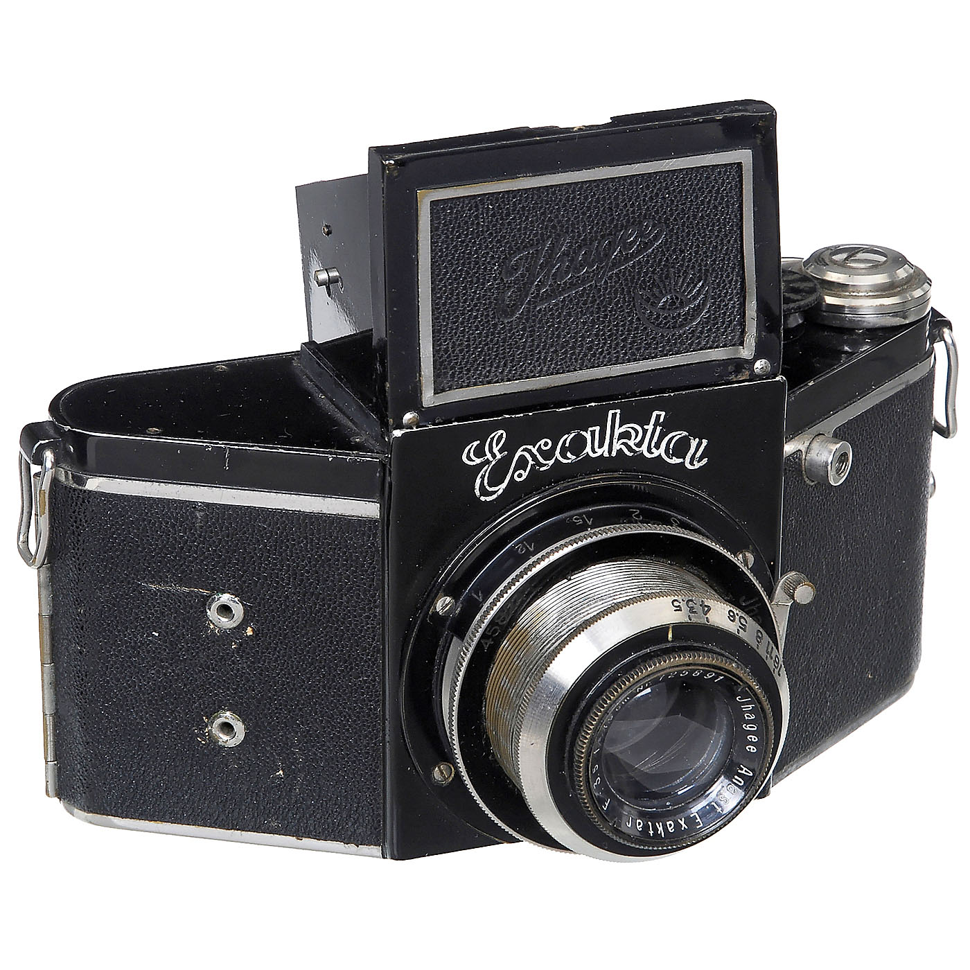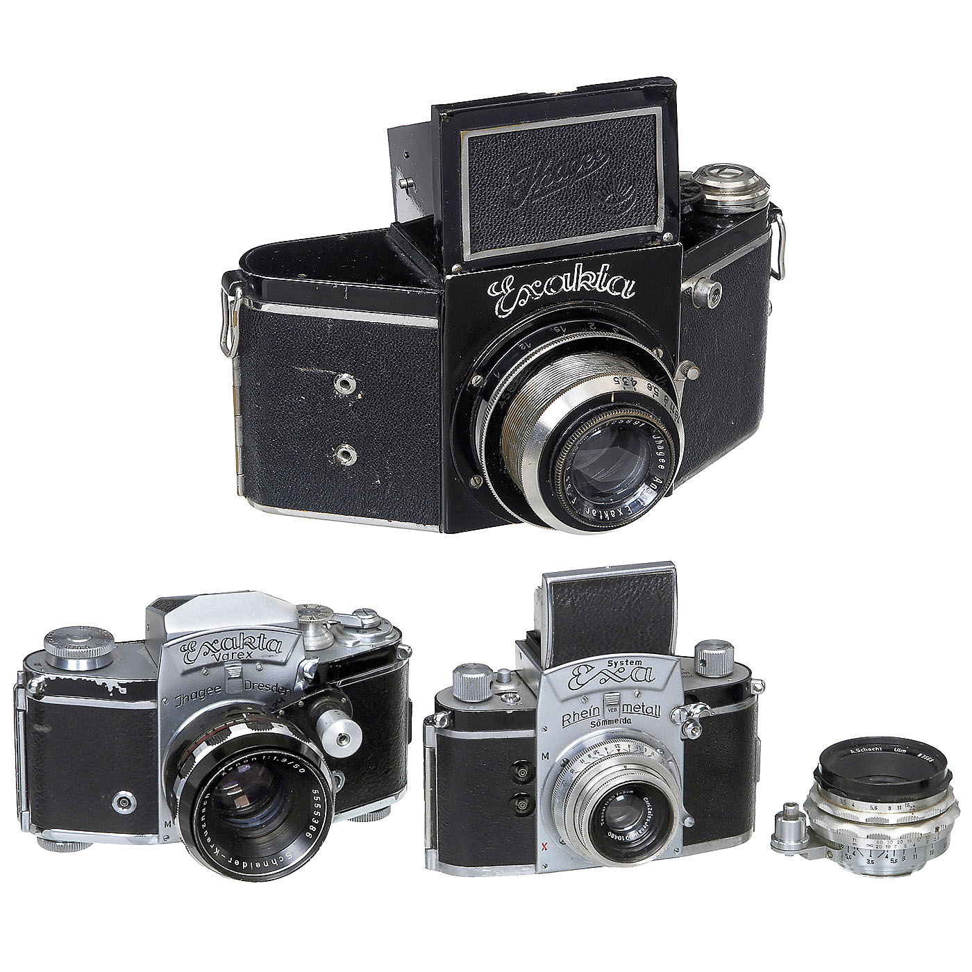 Ihagee, Dresden. 1) Exakta A, type 4.1, no. 458241, Exaktar 3,5/75 mm, focal plane shutter working. Rare in this good condition! (2-/2–3) – 2) Exakta Varex, no. 685211, with Xenon 1,9/50 mm. (3/2–3) – 3) System Exa Rheinmetall, no. 262148, Tessar 3,5/5 cm. (2-/3) – And: 4) Schacht Travegon 3,5/35 mm. (2/2-)