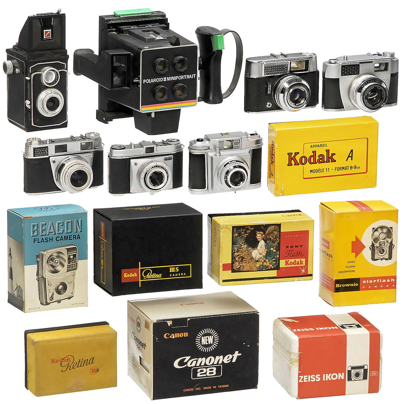Kodak Retina Ia, Brownie Starlet II, Kodak A model 10, Instamatic 314, Pony Flash Kodak, Brownie Starflash, Photina TLR 6 x 6, Vito automatic, Retinette f, Leidolf auto Malik, Bilora 4 x 4, Yashica Campus, Polaroid Miniportrait, Canonet 28, Contina, Agfa cameras and more. – Not tested and not all pictured.
