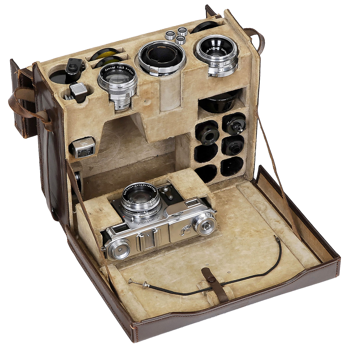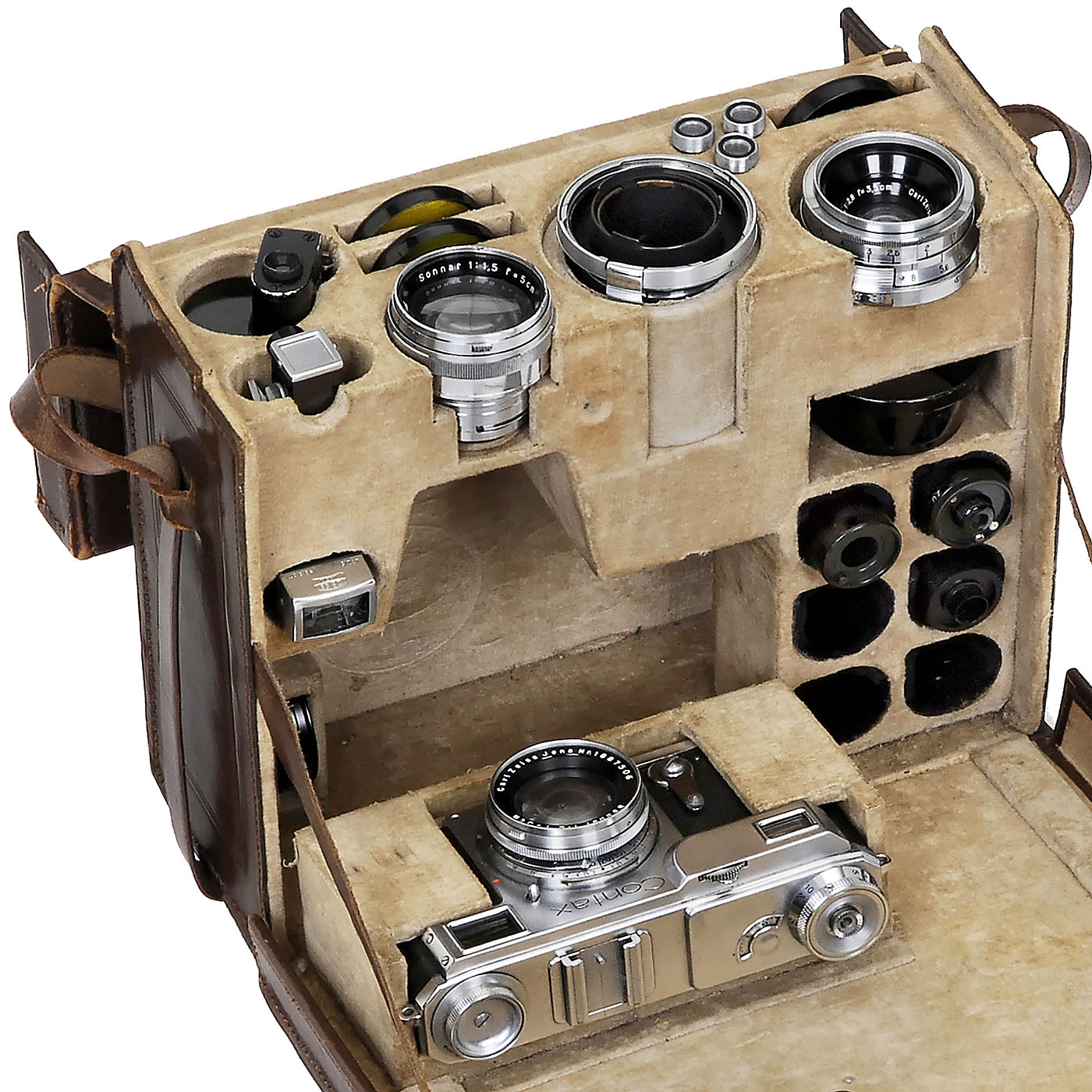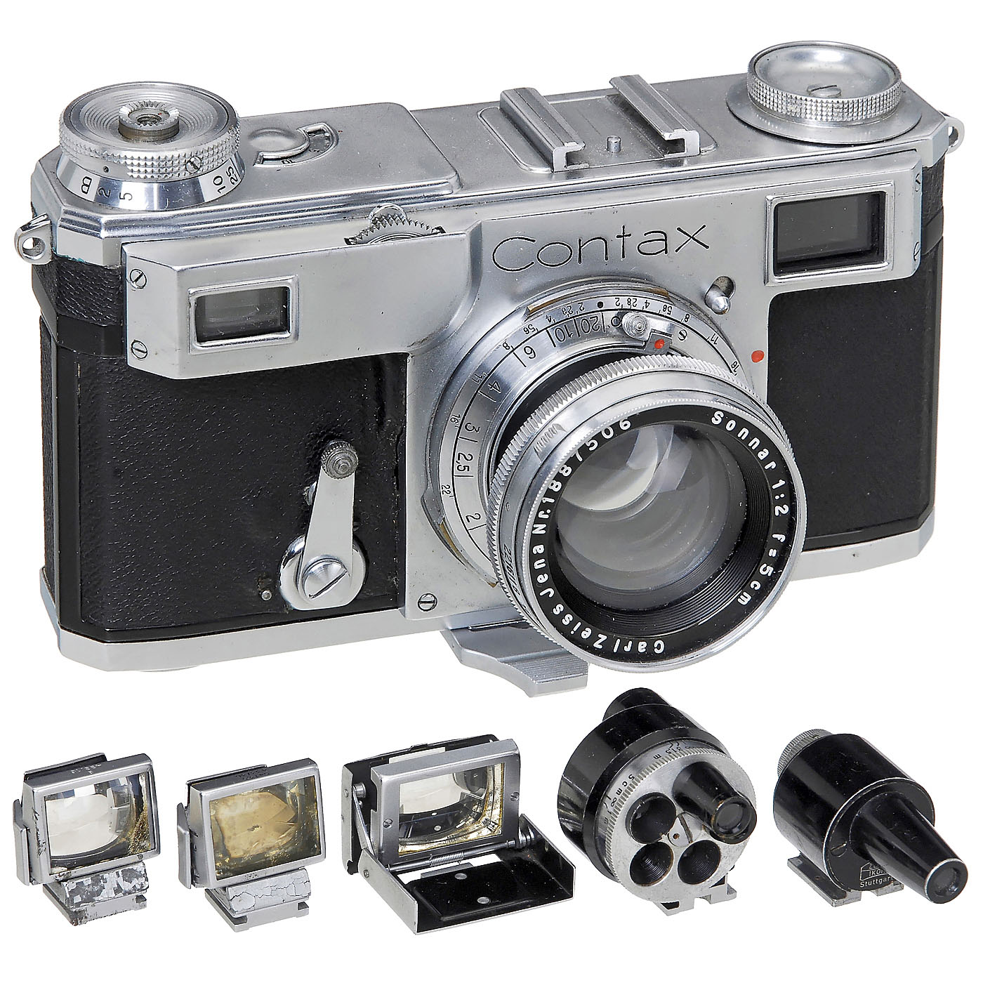 Zeiss Ikon, Dresden. 1) Contax II, no. B 31538. (3/3-) – 2) Biogon 2,8/3,5 cm, no. 2612736, with viewfinder (432/5). (3/3) – 3) Sonnar 1,5/5 cm, no. 2553041. (4+/3) – 4) Sonnar 4/13,5 cm, no. 2072200. (3-/3) – 5) Contameter (1343) with 3 oculars and 3 close-up lenses (995/34). (2-/2-) – 6) Universal viewfinder (436/70). (3/3) – 7) Rare Zeiss Ikon universal case (1777/23). – And: 8) Lens hood, 3 filters and 3 KB cassettes. – In addition: 5 Zeiss Ikon viewfinders.