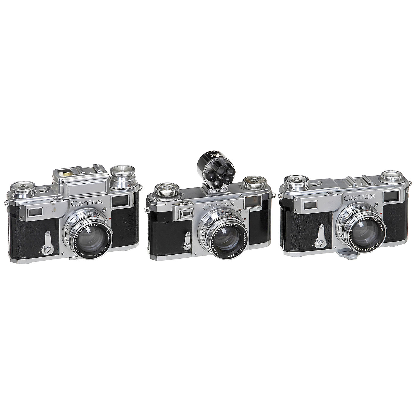 Zeiss Ikon, Jena/Stuttgart. 1) Contax II, no. J69346 with Sonnar 2/5 cm, no. 1885079, long times stuck. (3/3-) – 2) Contax III, no. B59480 with Sonnar 2/5 cm, no. 1864657, shutter inoperative. (3-/4) – 3) Contax IIa, no. F22347 with Sonnar 2/5 cm, no. 1885679, feet scale, shutter inoperative. (3-/4) – And: 4) Universal viewfinder, 440, with case. (2/2)