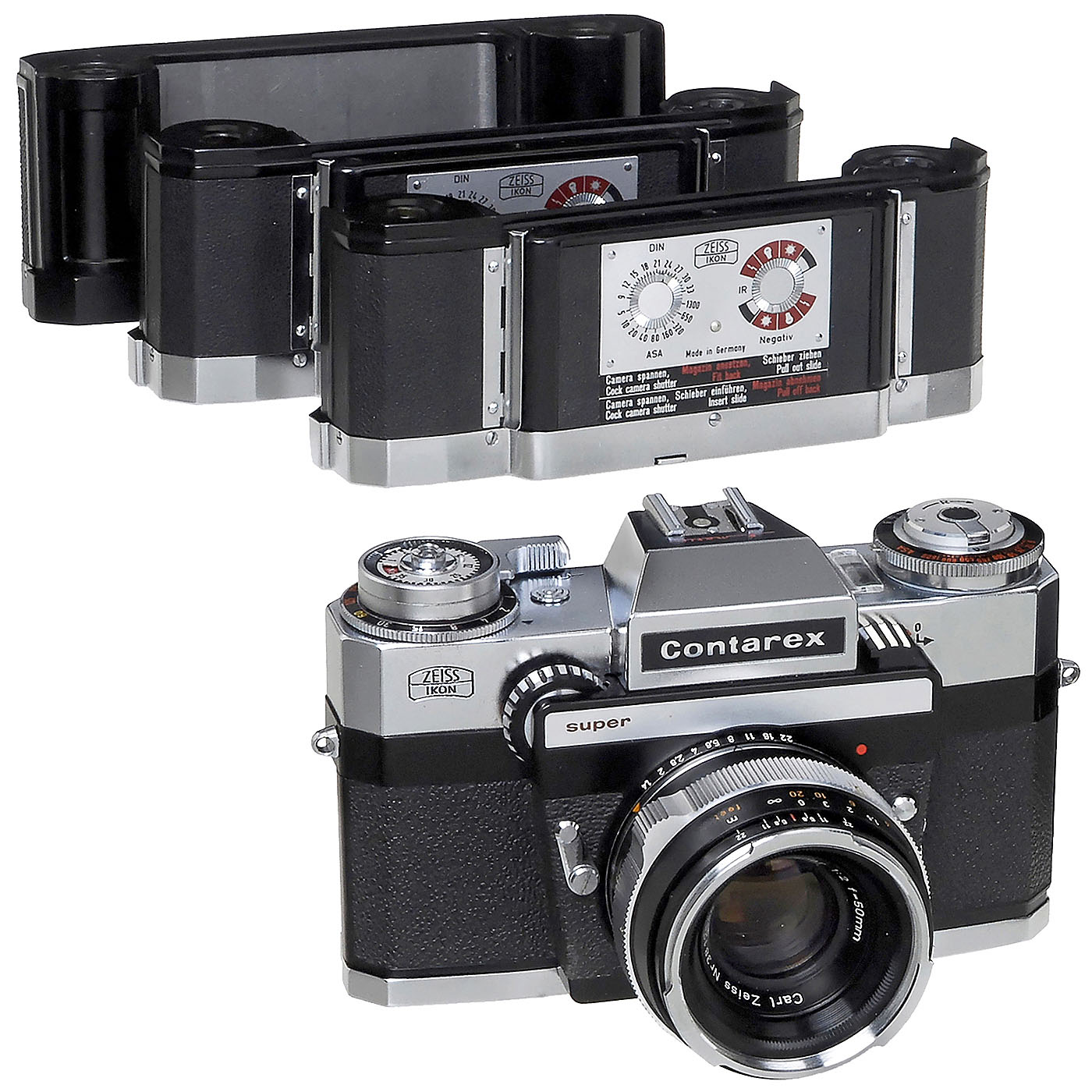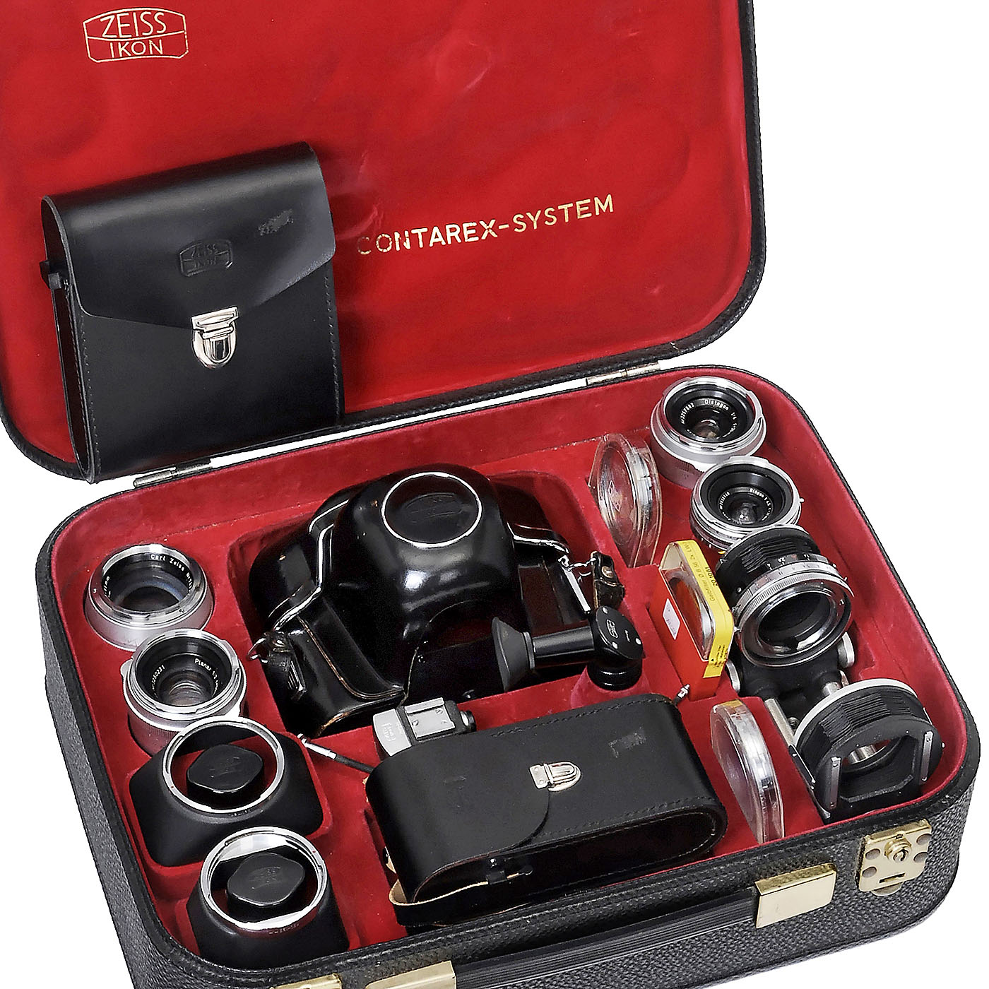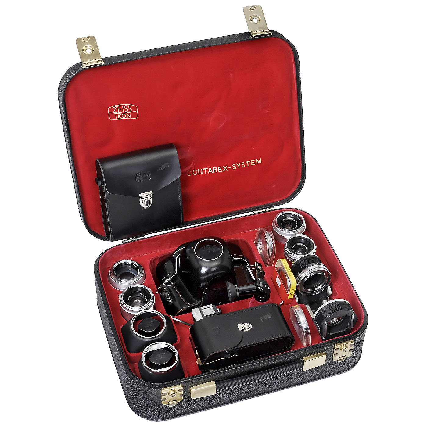 Zeiss Ikon, Stuttgart. 1) Contarex super, no. G 37572, first model, light meter not tested. With case. (3/3) – 2) Biogon 4,5/21 mm, no. 2622149, with viewfinder. (2-/3) – 3) Distagon 4/35 mm, no. 3257882. (2-/2-) – 4) "Flash" Planar, no. 3812544, black, coating defective on rear lens. (2-/3-) – 5) Planar 2/50 mm, no. 3250231. (3/3-) – 6) Sonnar 2/85 mm, no. 2623932. (3/3) – 7) Bellows unit with slide copier. – 8) Right-angle viewfinder. (2-/2-) – And: 9) Contarex-System case. (3-/–) – In addition: 3 magazines with cases, 3 filters and 2 sun shades.
