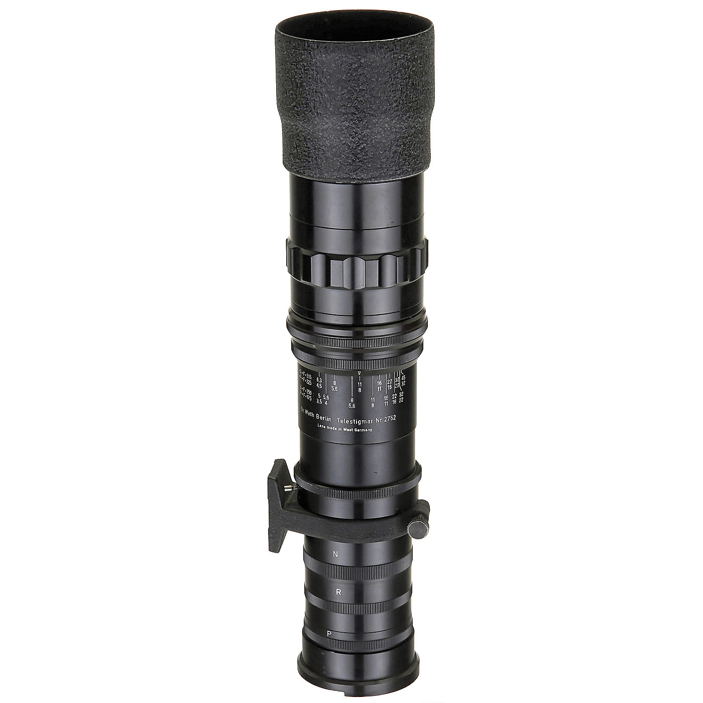 Dr. Weth, Berlin. No. 2752, combinable for 4 different focal length by 2 changeable lens elements: Petzval-type 3,5/175, 6 lenses 4,5/225, simple Achromat 5/250 and Aplanat 6,3/315. With tripod-mount, R-adapter (for macro), lens hood and filter. New price in 1963 was 426 DM. Extremely rare! The only modern universal lens for all four types of photography.