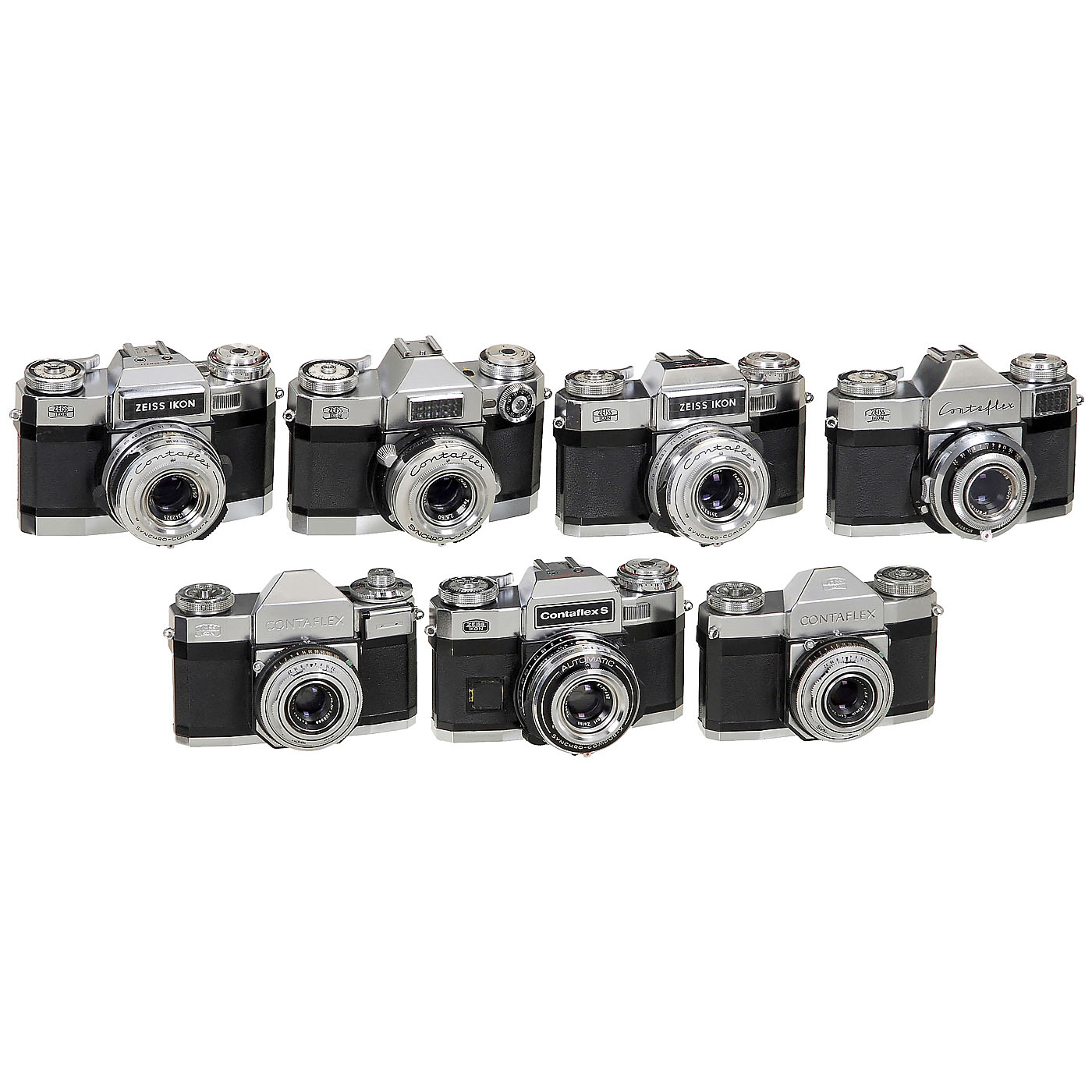 Zeiss Ikon, Stuttgart. 1) Contaflex I, 1953. No. G 6314, Tessar 2,8/45 mm. – 2) Contaflex II, 1954. No. F 10205, Tessar 2,8/45 mm. – 3) Contaflex prima, 1959. No. X 36382, Pantar 2,8/45 mm. – 4) Contaflex Super, 1959. No. Z 53283, Tessar 2,8/50 mm, with magazine. – 5) Contaflex Super B, 1962. No. F 16503, Tessar 2,8/50 mm, with magazine. – 6) Contaflex Super B, 1962. No. B 46766, Tessar 2,8/50 mm. – And: 7) Contaflex Super BC, 1965. No. U 55821, Tessar 2,8/50 mm.