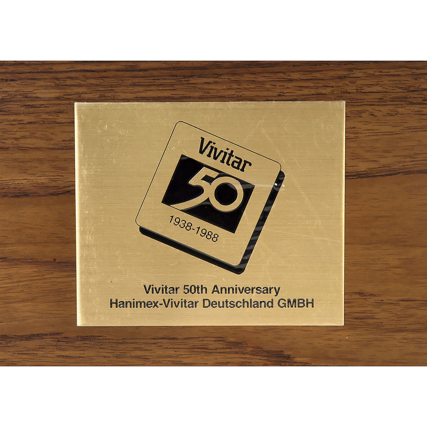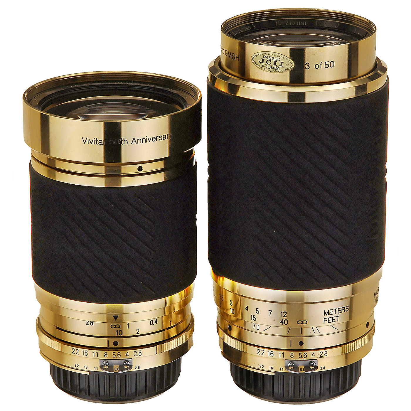 Hanimex-Vivitar Deutschland GmbH. "Vivitar 1938–1988", "Vivitar 50th Anniversary. 1) Series 1 28–105 mm 2,8–3,8, serial no. "No. 03 of 50". – And: 2) Series 1 70–210 mm 2,8–4, serial no. "No. 03 of 50". – Only 50 lenses of this type in gold were produced. With Nikon AI-S (F) mount, in wood case and card box.