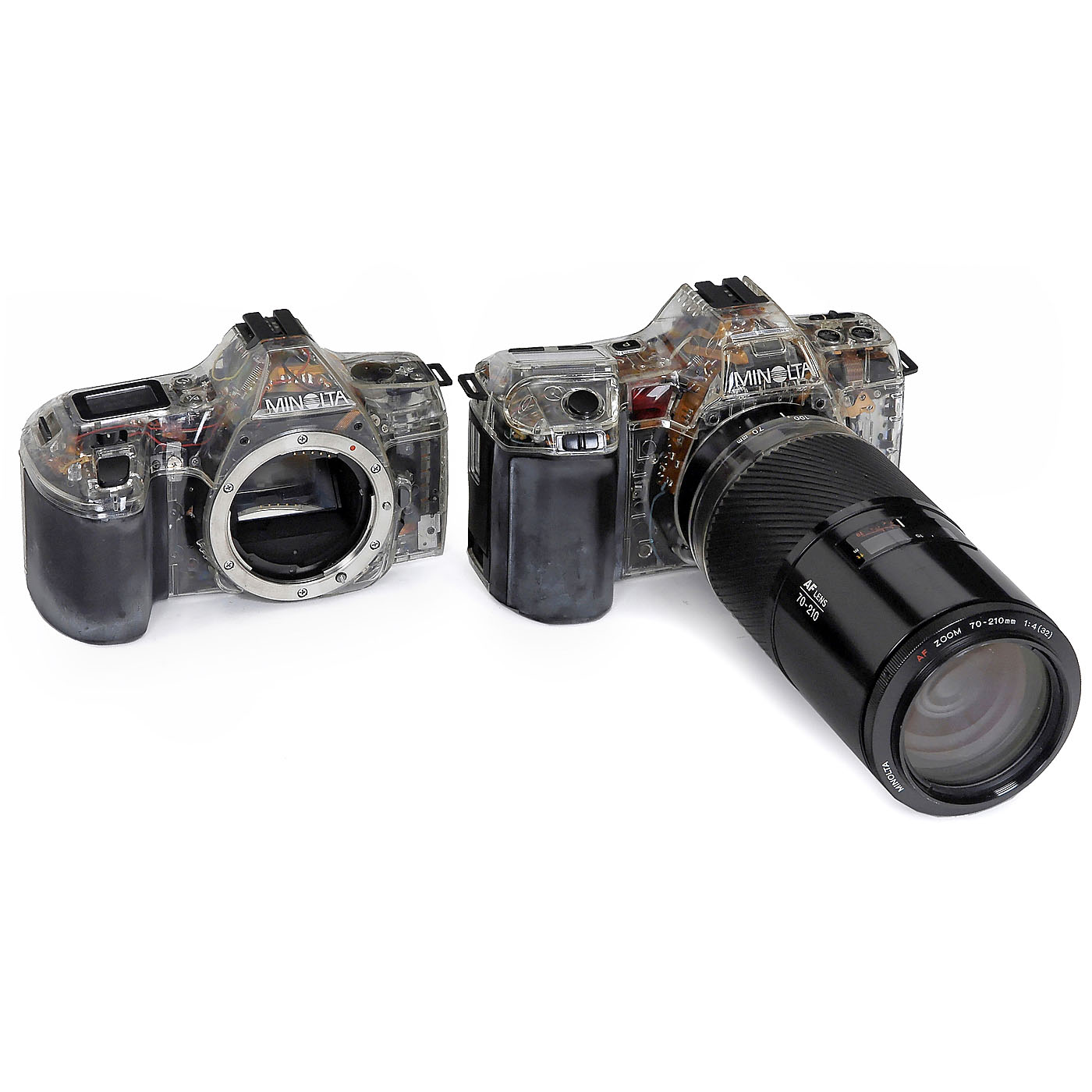 Minolta, Japan. 2 Dynax AF reflex cameras with transparent bodies for demonstration and decoration. Only produced in very limited quantities for important resellers! Non-functioning models. With very rare Minolta AF-Zoom 4/70–210 mm with transparent ring giving insight into the zoom's function.