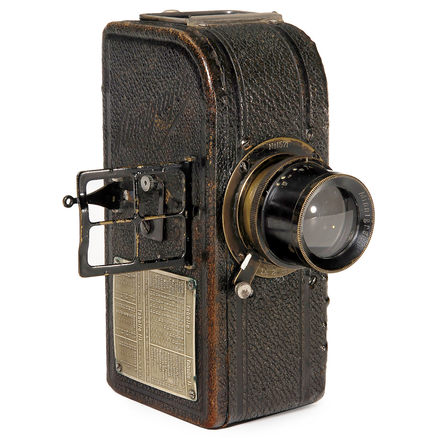 Levy-Roth, Berlin. The first European 35mm camera, size 18 x 24 mm. One spool inside, with exposure table, original lens: Minnigraph Berlin, body no. 1571, counter for 45 pictures. – Important pre-Leica collector's item! – Literature: Michel Auer, "150 ans d'appareils photographiques", no. 206, und Paul-Henry van Hasbroeck, "150 Classic Cameras", p. 123. – Good working condition.