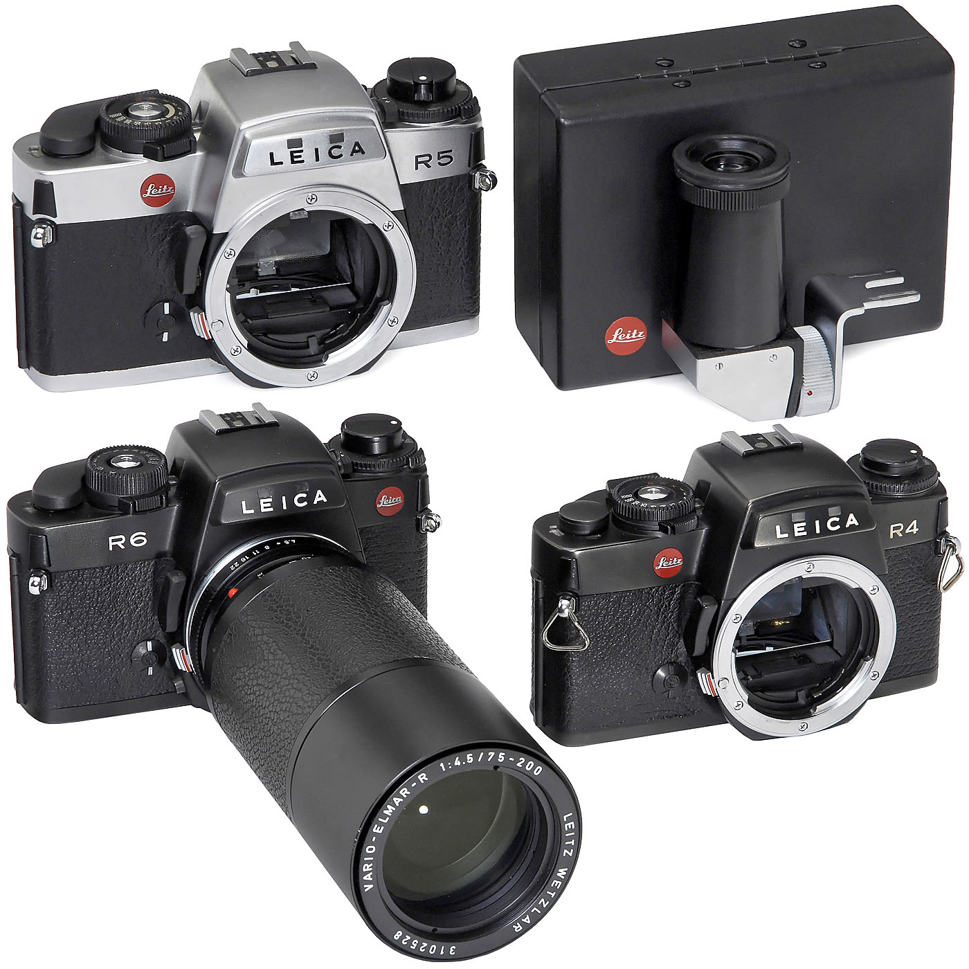 Leitz, Wetzlar/Solms. 1) Leica R6, no. 1729516, c. 1987, with body cap. (3+/3) – 2) Leica R5, no. 1732636, chrome, c. 1987, with body cap, instructions and box. (2-/3) – 3) Leica R4, no. 1661987, c. 1984, with body cap. (3-/3) – All R-camera shutters and self-release functions work. Other functions not tested! – 4) Leitz Vario-Elmar-R 4,5/75–200 mm, no. 3102528 (Japan), with both caps. (2/2) – And: 5) Angle viewfinder 14326, with case. (2/2)