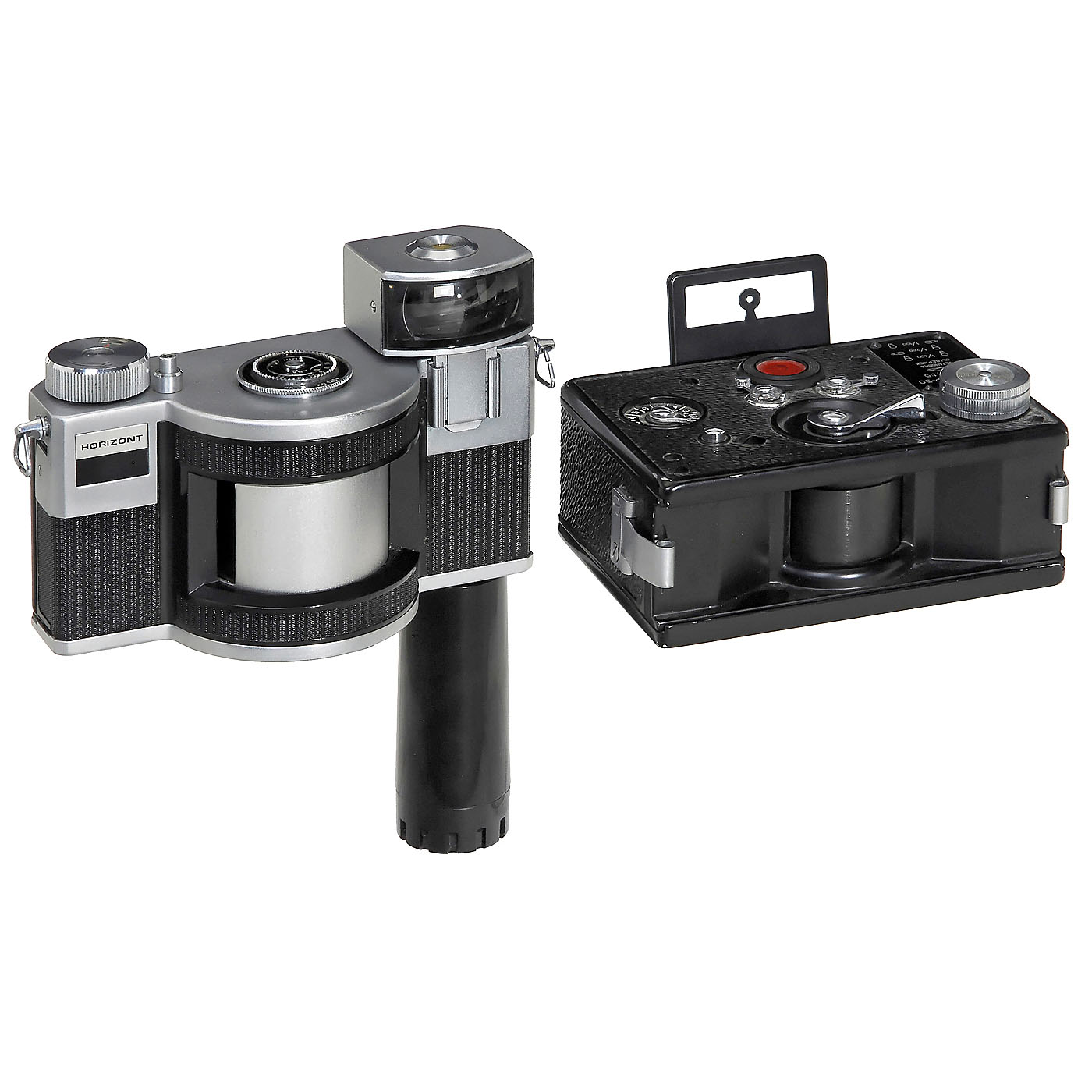 USSR. 1) Horizont, 1972, panoramic camera 24 x 58 mm, 1/30–1/250 sec., works smoothly and well, with grip and viewfinder, base with maker's stamp "Author certificate". – And: 2) Panoramic camera FT-2, 1962, 24 x 110 mm on 35mm film, Industar 3,5/50 mm, shutter speeds 1/100–1/400 sec., works well and smoothly, and with 2 special cassettes. – A meaningful test can only be carried out with loaded film, however the shutters appear to be functioning correctly.