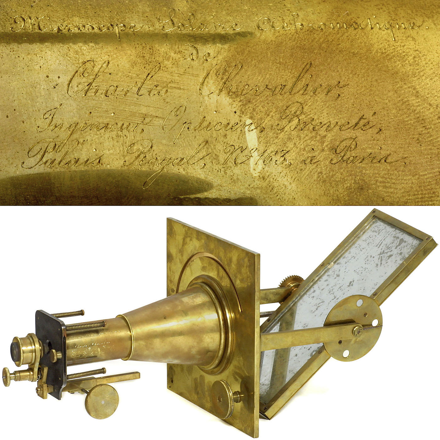 Microscope Solaire Achromatique Charles Chevalier, Ingenieur, Opticien, Breveté, Palais Royal, No. 163, à Paris. Polished brass. Total length 22 in. Rack-and-pinion movement of the mirror works smoothly. Mirror size 11 x 4 ¾ in. Focusing of the micro-projection lens via rack and pinion. Glass clean, good optical performance. – Early and very sought-after collector's item and top museum piece! – A great rarity!