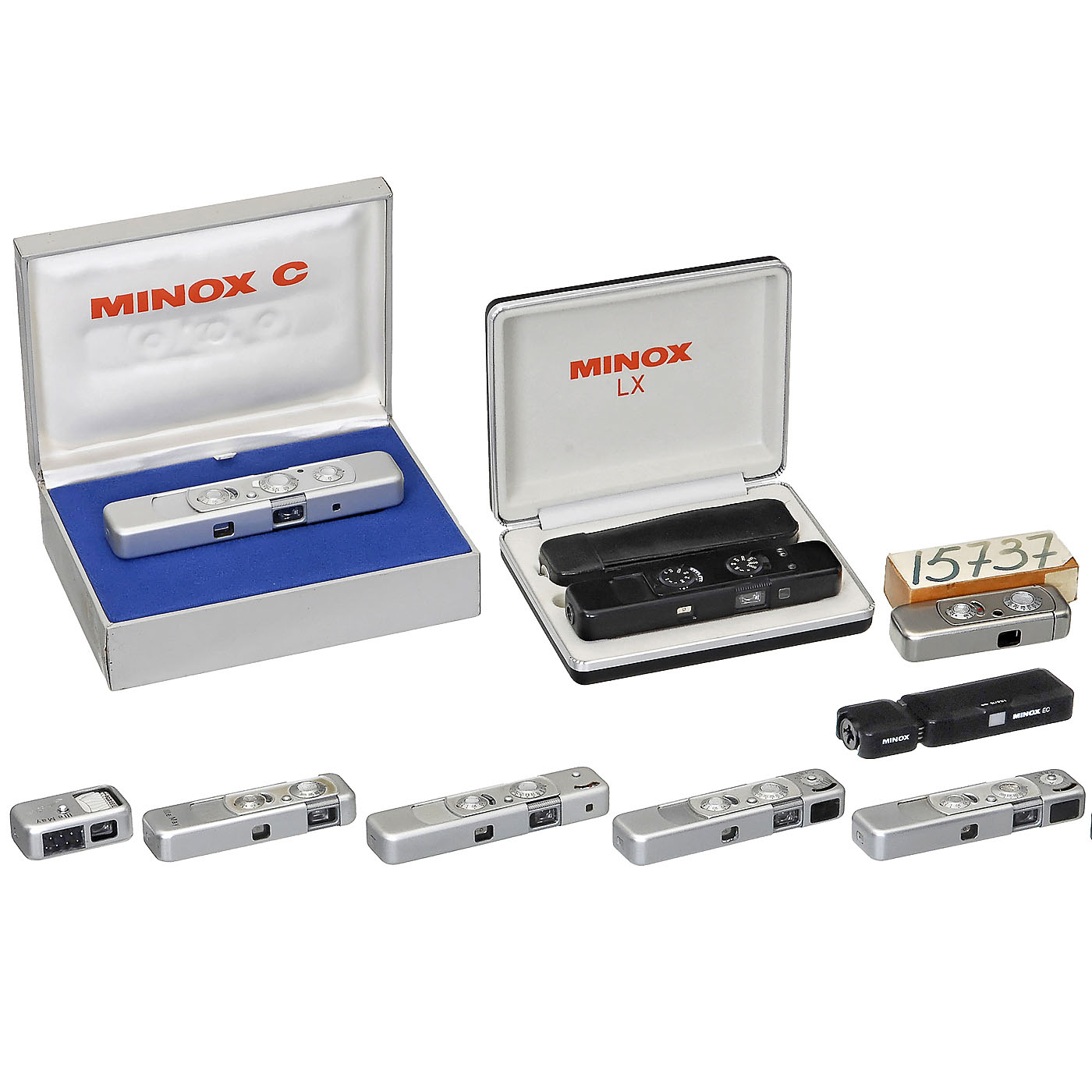 Minox, Wetzlar/Gießen. 1) Minox LX, black, no. 2512758, c. 1980, with case and box. – 2) Minox BL, no. 1213981, c. 1973. – 3) Minox C, no. 2360064, c. 1971, with case, instructions, guarantee card and box. – 4) Minox B, no. 854191, c. 1966, with case and chain. – 5) Minox B (Wetzlar), no. 723960, c. 1962, with case and chain. – 6) Minox A (III), no. 38393, c. 1951, with case "red", chain and MinoSix, with case and chain. Both with engraved name. – 7) Minox EC, no. 2794672, c. 1985, with flash and chain. – And: 8) Finally, the basics for every Minox collection: In complete Riga-Minox "Made in Latvia" with cardboard box no. 15737, possibly for storage.