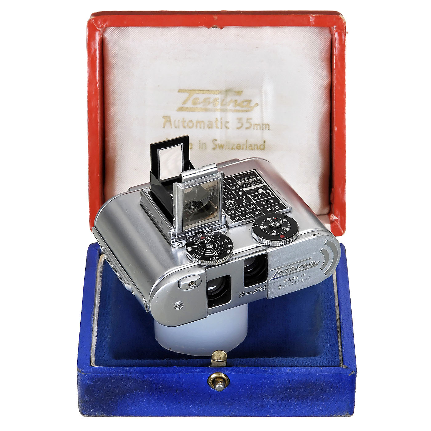 Concava, Lugano, Switzerland. Chrome, no. 769900, size 14 x 21 mm, Tessinon 2,8/25 mm, clockwork drive, with Albada viewfinder. – In addition: Original case.