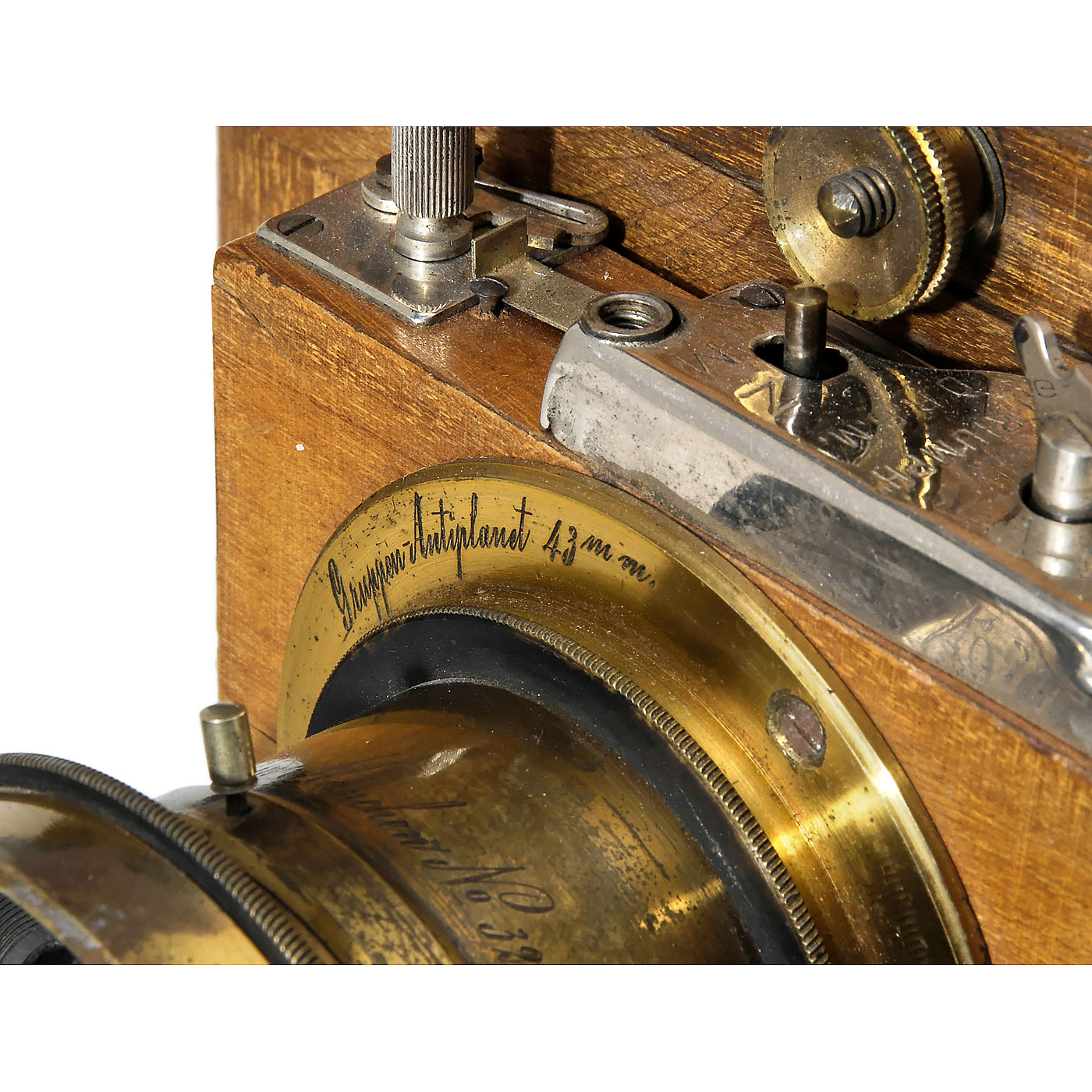 Unmarked early field camera with rotating focusing screen back (portrait and landscape format), size 13 x 18 cm (5 x 7 in.), polished wood with brass fittings, green conical bellows. With Steinheil "Gruppen-Antiplanet 43 mm", F = approx. 10 in., serial no. 32656, produced c. 1891, with original rare aperture and ring in "Triumph" roller-blind shutter, shutter and aperture in good working condition.