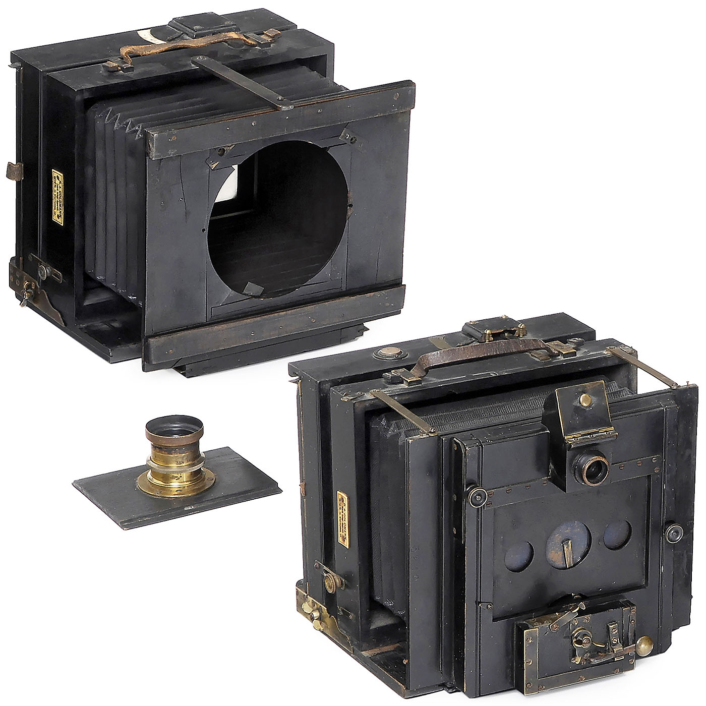 R.A. Goldmann, Vienna, IV. Victoriag. 14. 1) Universal stereo camera for 13 x 18 cm, no. 5219, rotating shutter works, with focusing screen back and 3 double cassettes. – In addition: Replaced plate with Busch Rapid Aplanat Ser. D. No. 2. – And: 2) Universal camera for 13 x 18 cm, no. 3808, with focusing screen back. – Both cameras are quite sturdy, and even without lenses capture some of the charm of Vienna.