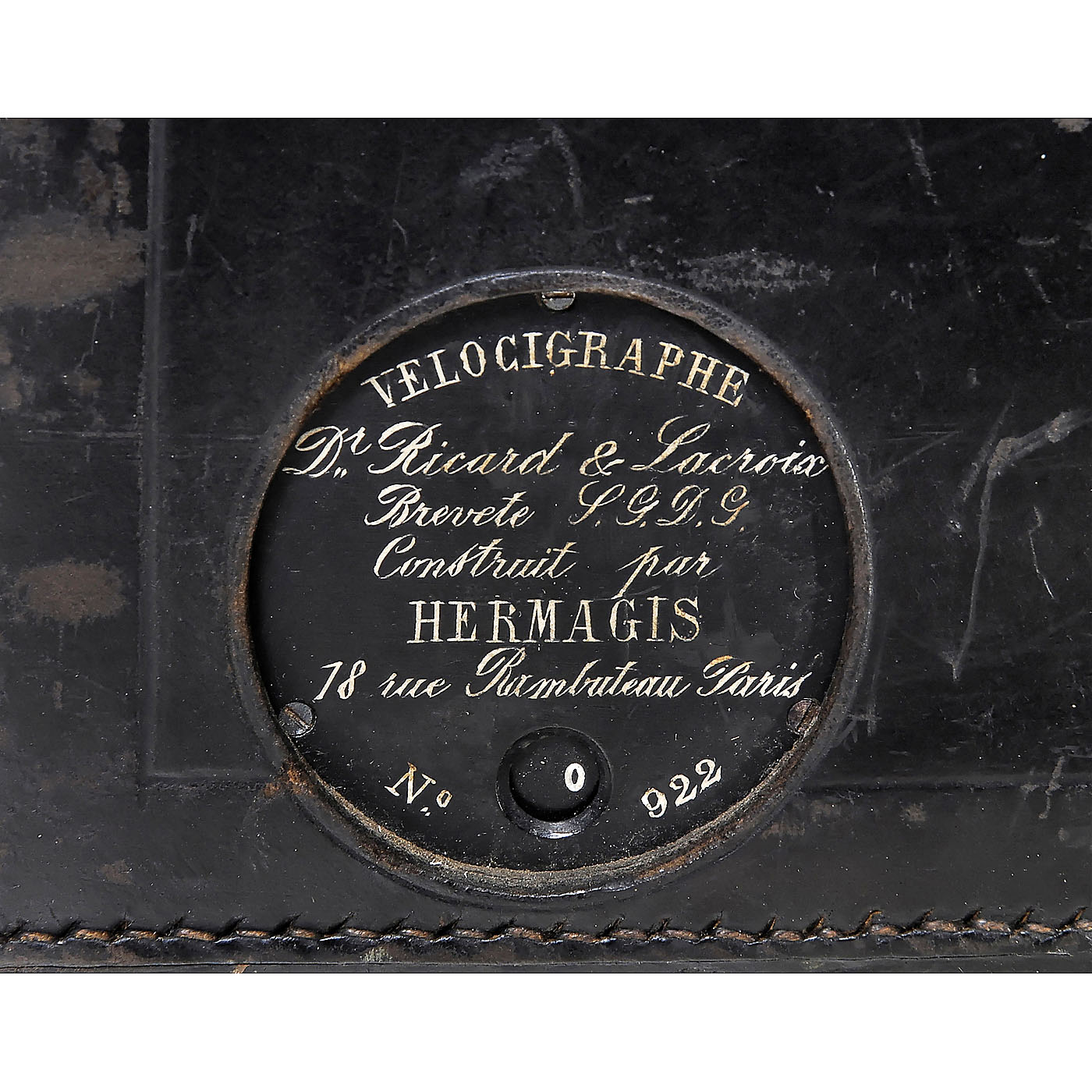 Dr. Ricard & Lacroix, construit par Hermagis, 18 rue Rambuteau, Paris. Serial no. 922! Drop-plate magazine camera in polished wood body, rotating shutter, Hermagis Aplanastigmat No. 8 (Dagor-type) no. 32081. Working camera in nice condition. Is in original leather case with the clap for photographing. One of the most popular detective cameras! Because of the original leather case, the Velocigraphe looks like an espionage camera.