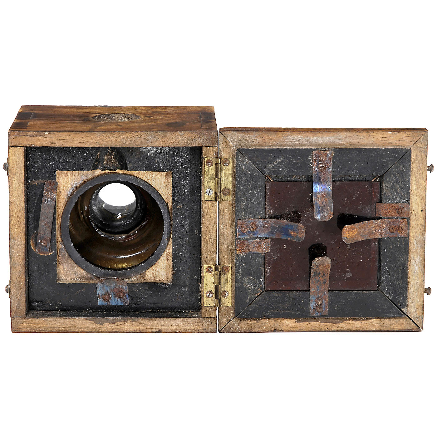 Appareil Dubroni. Breveté S.G.D.G. à Paris 236 rue de Rivoli. With partly enclosed dark-brown glass bottle, for circular pictures of 4 cm Ø. With lens marked "Dubroni à Paris". – A fantastic milestone and a spectacular exhibition piece: the world's first instant camera!