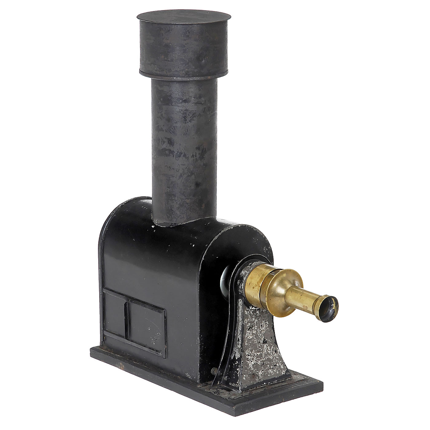 C.P. Stirn, Berlin. Extremely rare enlarger in the form of a magic lantern, with black-lacquered tin body, brass lens and holder for round original Stirn discs, height 16 ½ in., complete with wood transport box. – Very attractive exhibition piece and desirable collector's item!