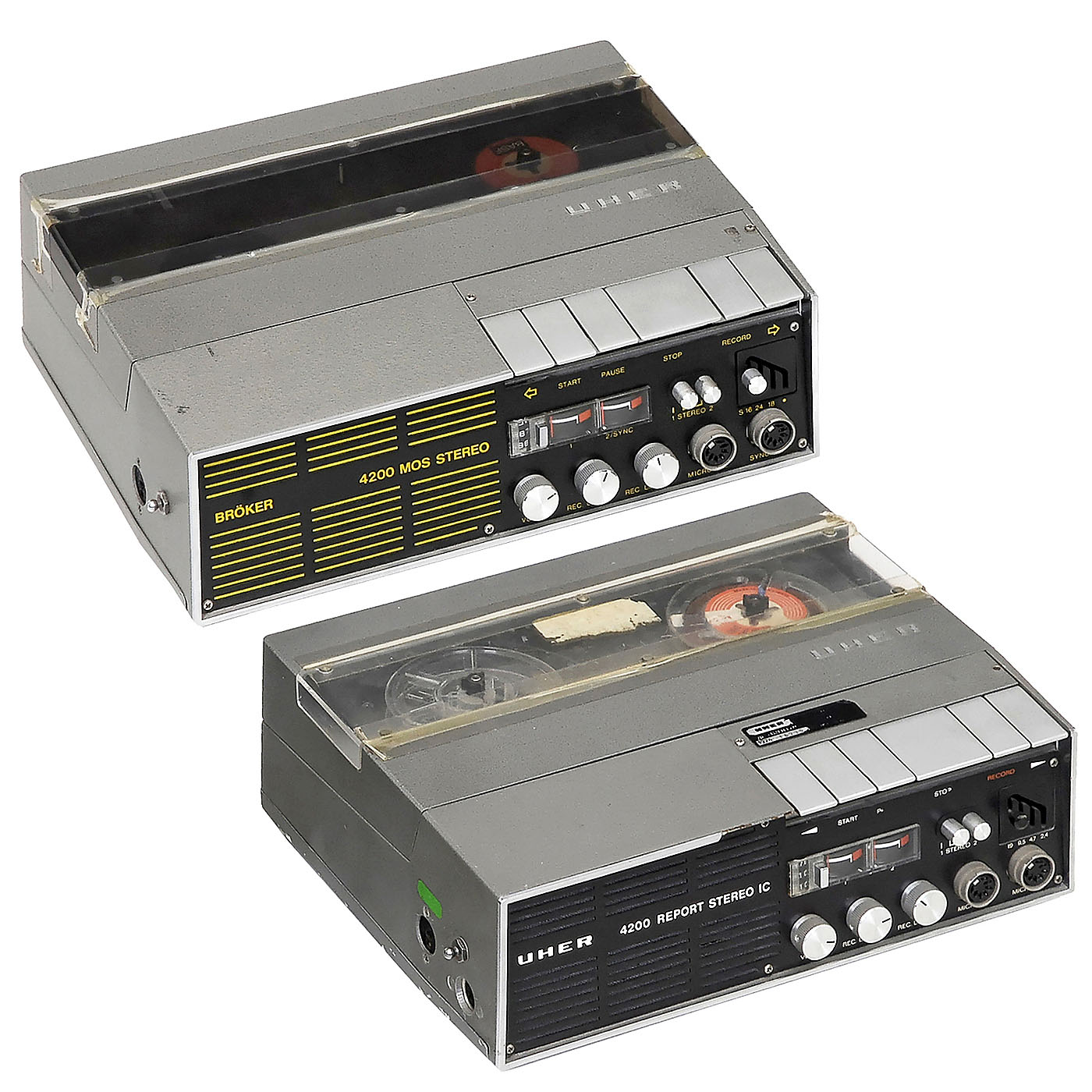 2 tape recorders: 1) Bröker 4200 MOS Stereo, modified Uher-Report model for slide or film setting, cord-tape system, with the same perforation of the tape as for the film. – And: 2) Uher 4200 Report Stereo IC. – Both devices not tested. With one power supply and 2 original Uher leather bags.