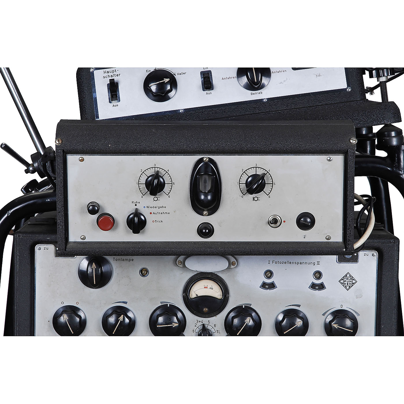 Leitz, Wetzlar. For 1200m spools, Elkinar 1:1,3/5 cm lens, optical and magnetic sound heads, Telefunken tube amplifier, original steel table, control desk for magnetic recording, with manual, electric functions untested. – This G1 was Europe's most expensive and best 16mm projector!