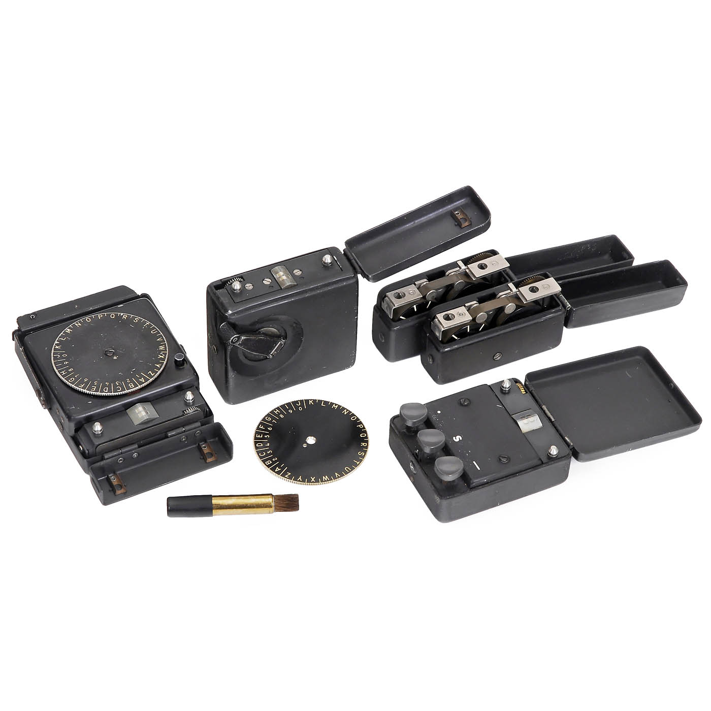 Arvin Industries, USA. Device for pre-recorded coded messages to be broadcasted in Morse code at very high speed, military version, modular system, consisting of following separate devices: 2 x MA-9 tape cartridge, MX-4495 dot-dash tape coder, MX-4496 wheel tape coder, alternative index wheel for MX-4496, soft cleaning brush and KY-468 keyer. Together housed in a water-tight metal container lids.