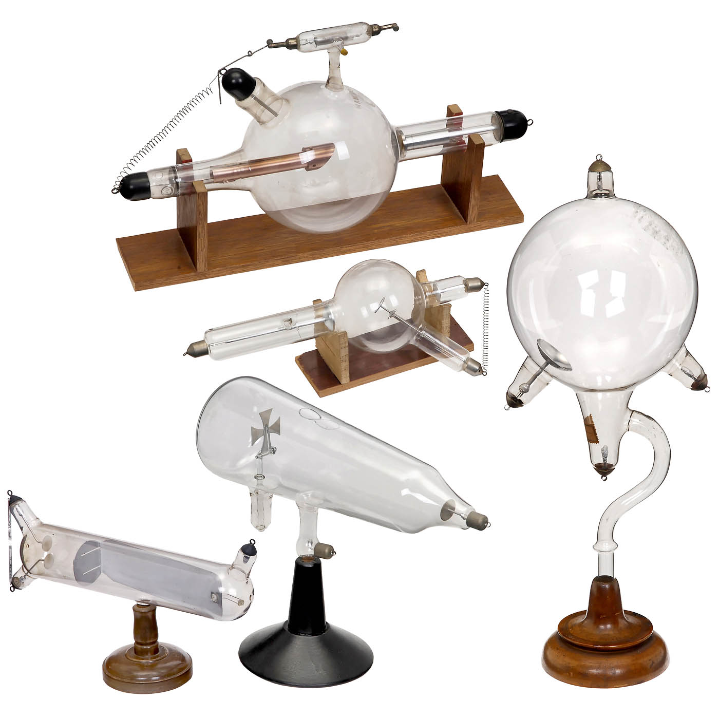 1) "Mammoth" X-ray air-cooling tube with regeneration device, made by Cuthbert Andrews, England, length 20 in. - 2) Crookes cathode ray tube, for demonstrating the influence of an electric field on the electron beam, on wood base, length 11 3/5 in. - 3) Cathode ray tube according to Crookes, showing cathode rays being emitted from the cathode and traveling to the 3 anodes, height 13 in. - 4) X-ray tube, made probably by Rudolf Pressler, Cursdorf, length 13 in. - And: 5) "Maltese Cross", cathode ray tube with aluminum cross inside the tube, designed to flip down, 12 ½ in. wide.