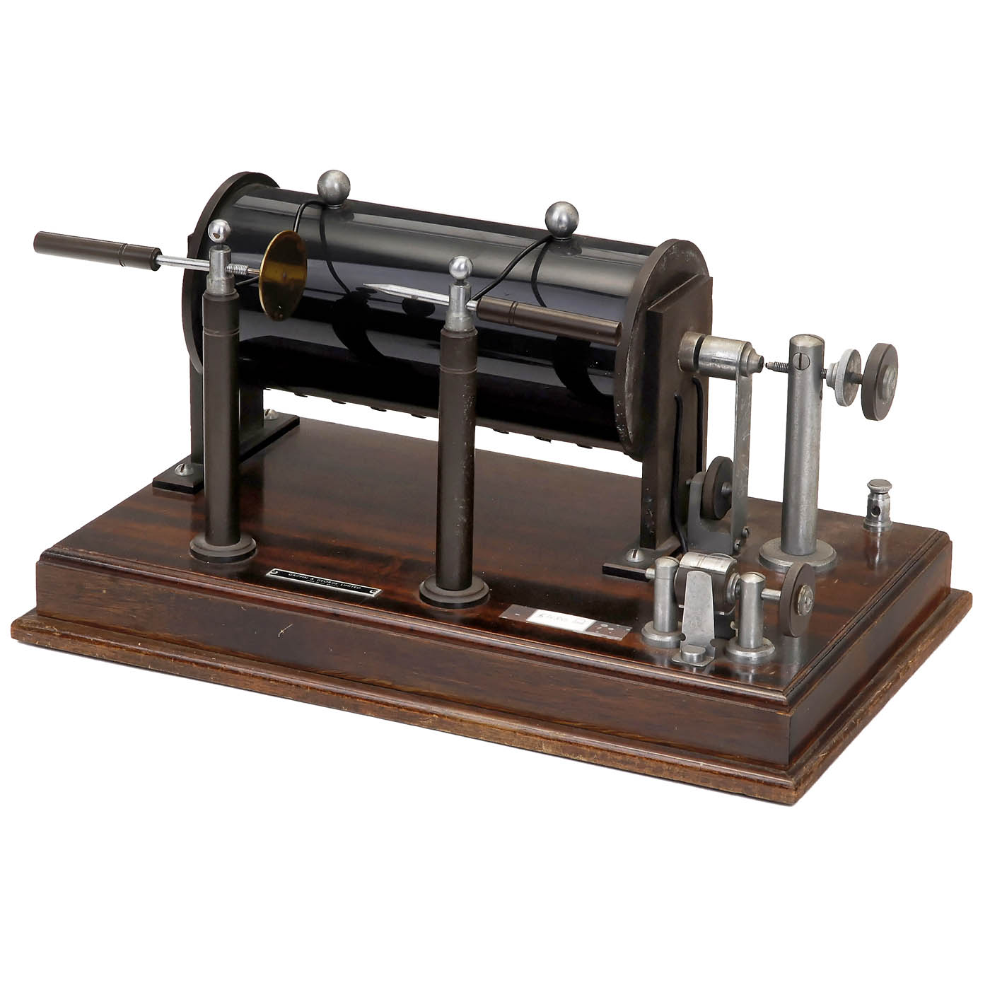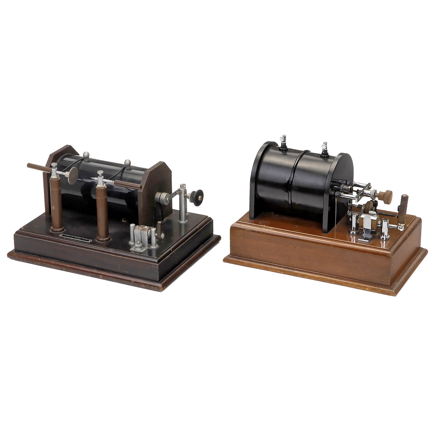 1) 10 ½ in. induction coil by Griffin & George, Great Britain. With commutator and spark gap, on mahogany base, 18 x 11 in. - 2) 6-inch induction coil, unmarked, with commutator, on walnut base, 13 x 8 in. - 3) 8 ¼ in. induction coil by Griffin & George, Great Britain. With commutator and spark gap, on mahogany base, 12 ½ x 9 ½ in. - And: 4) 5 Leyden jars, height up to 10 ¼ in.