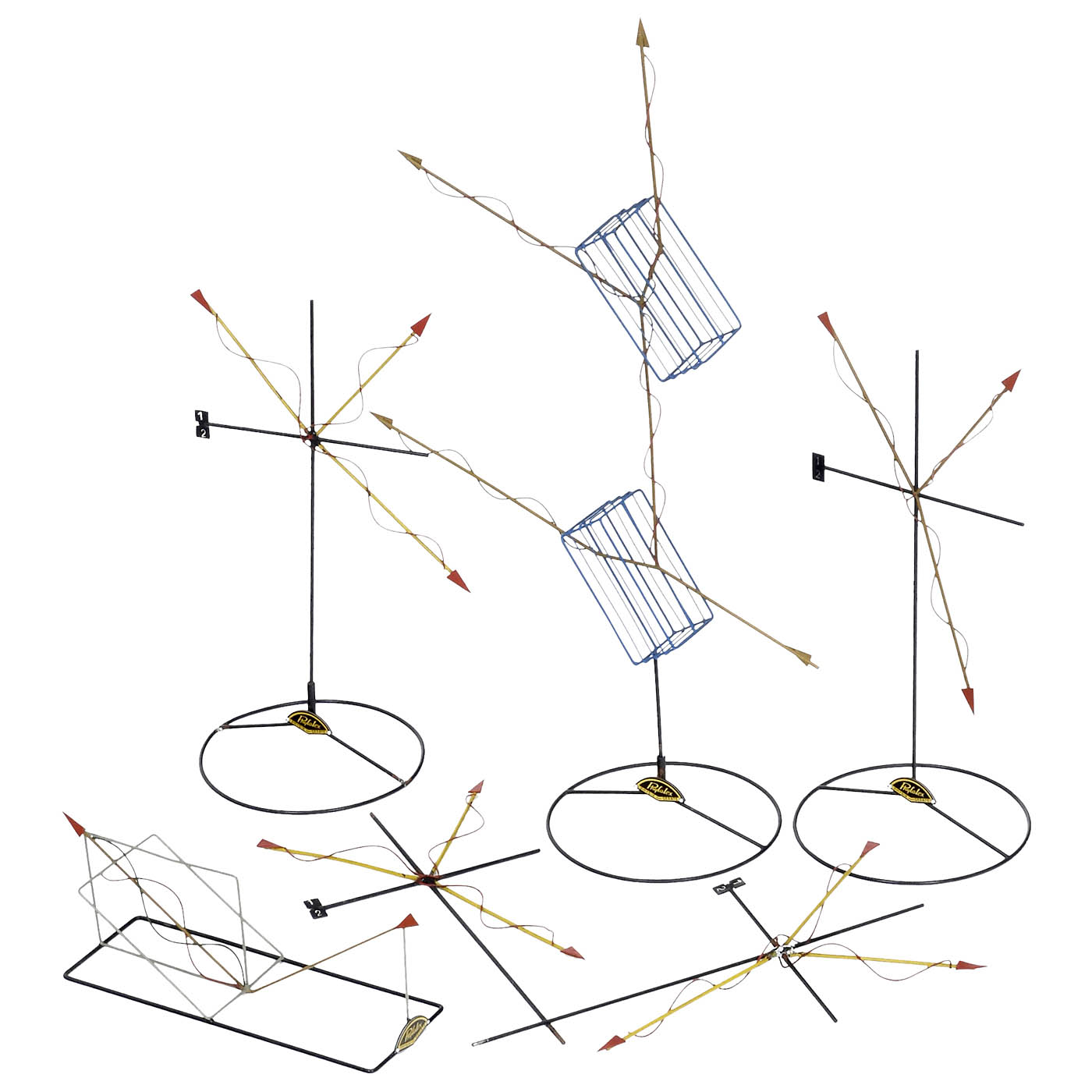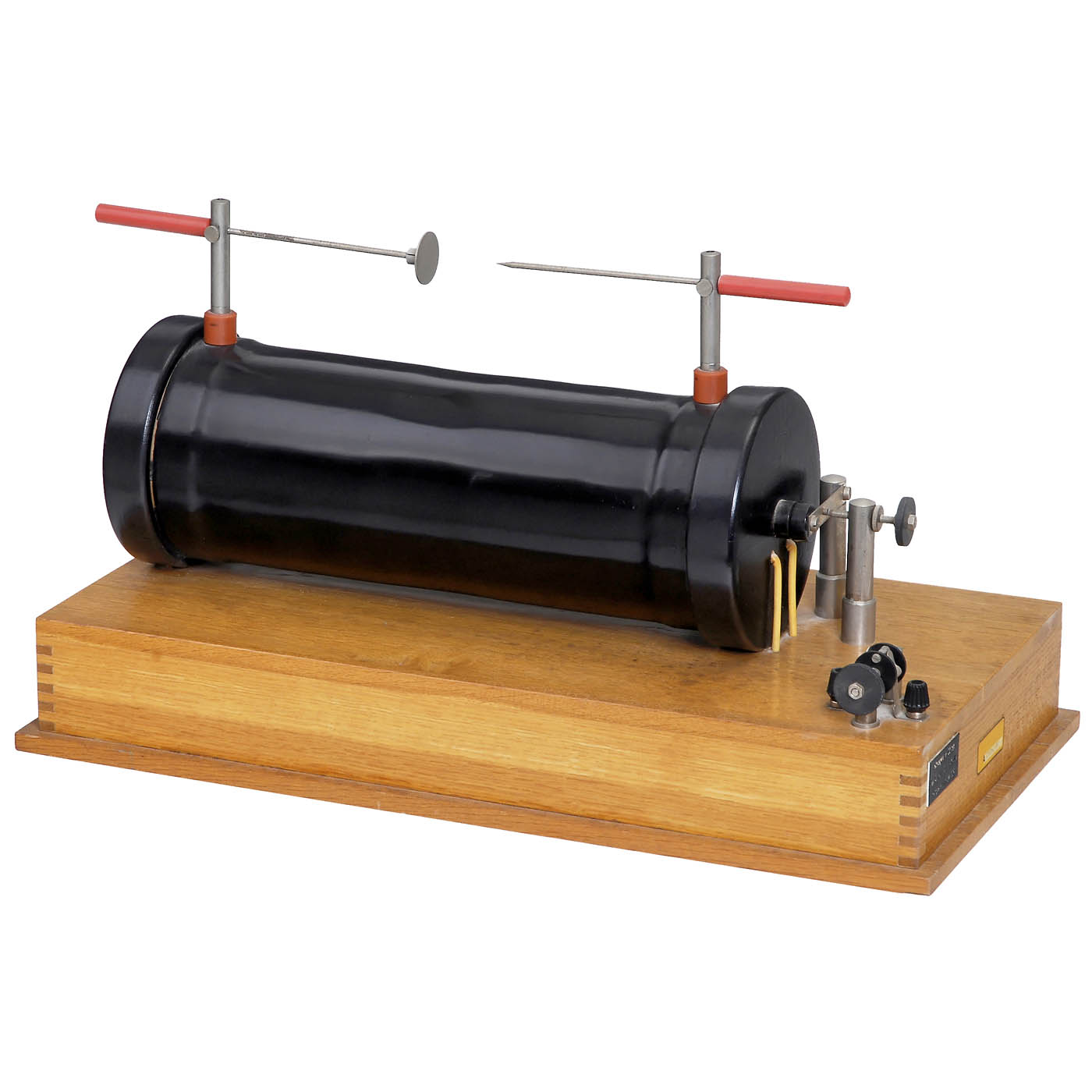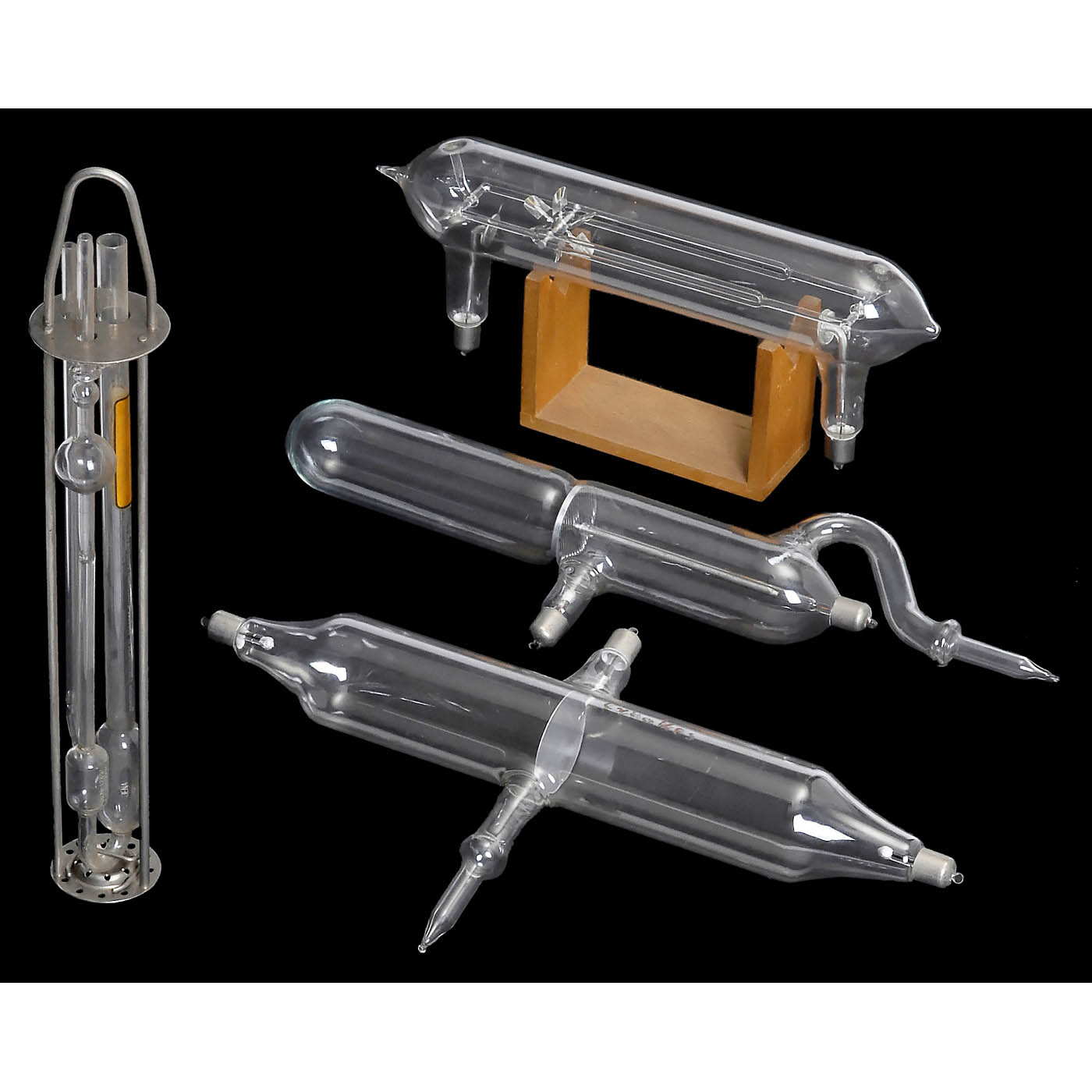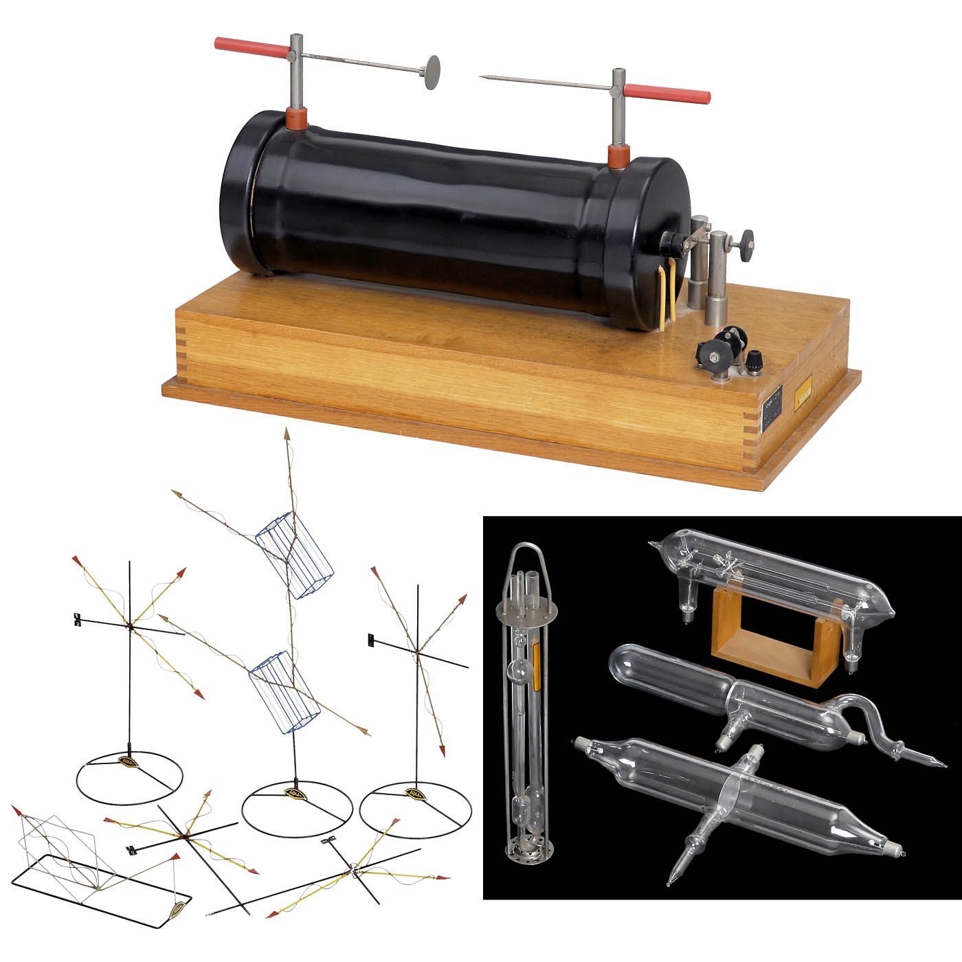 1) Induction coil, c. 1960, made in GDR, length of the coil 15 ¾ in., 12 V, 2-3 ampere, for sparks up to 4 ¾ in. - 2) 3 Crookes tubes, length up to 14 ½ in. - 3) 6 electric-wave demonstration models, made by Phylatex. - And: 4) Ubbelohde viscometer, Jena glass, height 13 in.