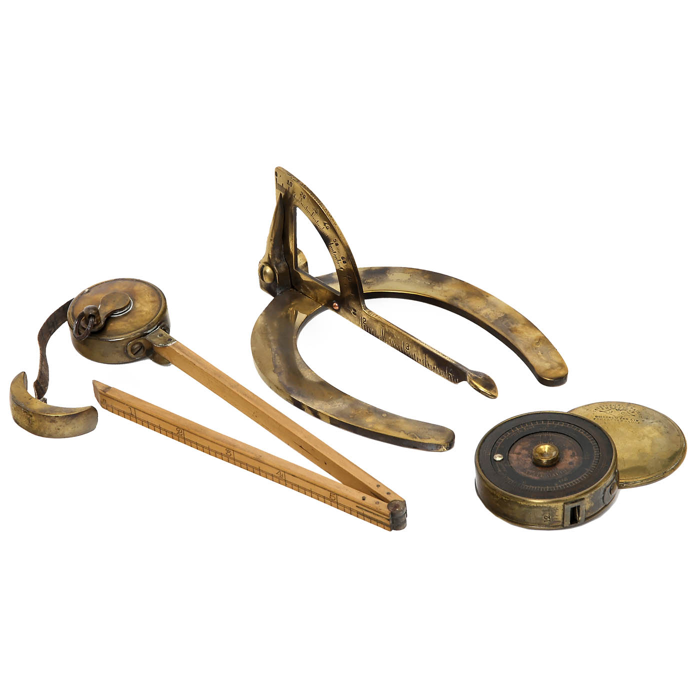 1) Horse measure by Cooper W. Jones & Co. Boxwood and brass. - 2) Cattle gauge, Chesterman's Patent. Brass, tape torn. - And: 3) Brass horseshoe measuring device.
