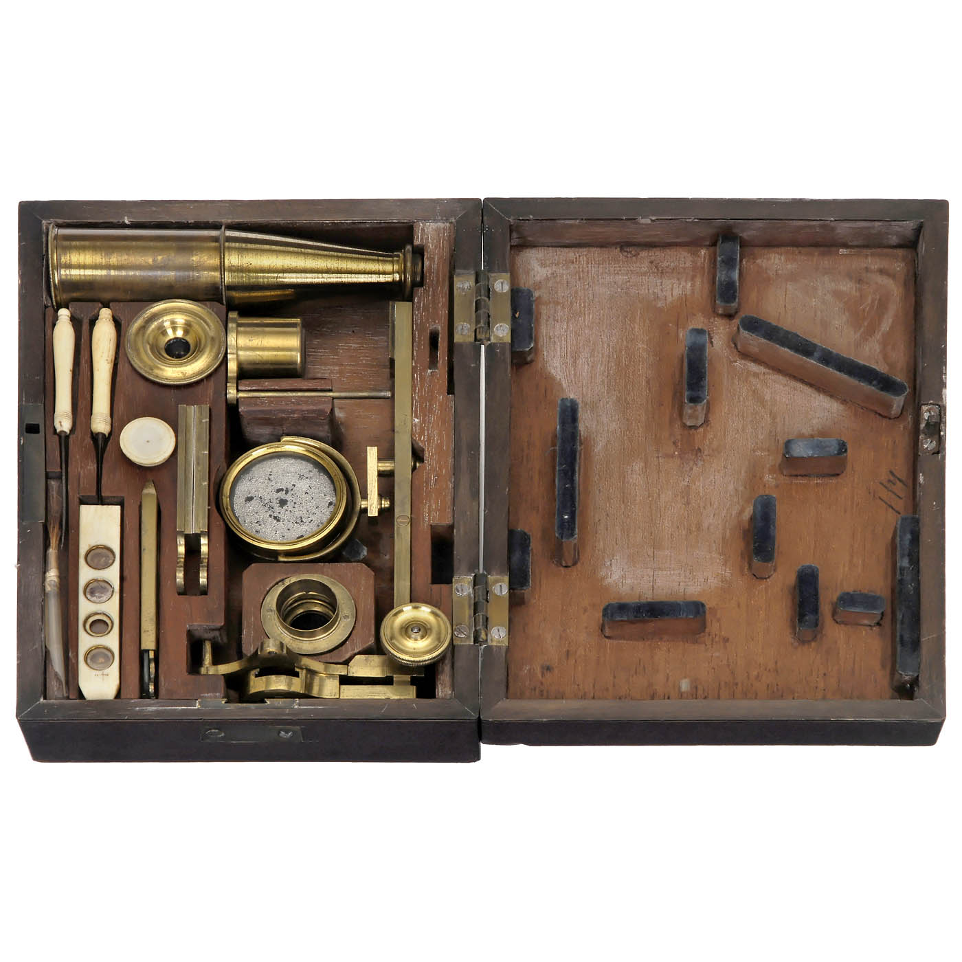 Signed: "Tho. Harris & Son, London". Lacquered brass, 2 brass slides, each with 3 lenses, allowing a quick change of magnification, rack-and-pinion focusing to the stage, spring clips, 2 openings for condenser and forceps, double mirror, tube with screwed eyepiece and conical lower end, overall height 11 in. With 1 ivory slide and further accessories in mahogany case that serves as instrument base.