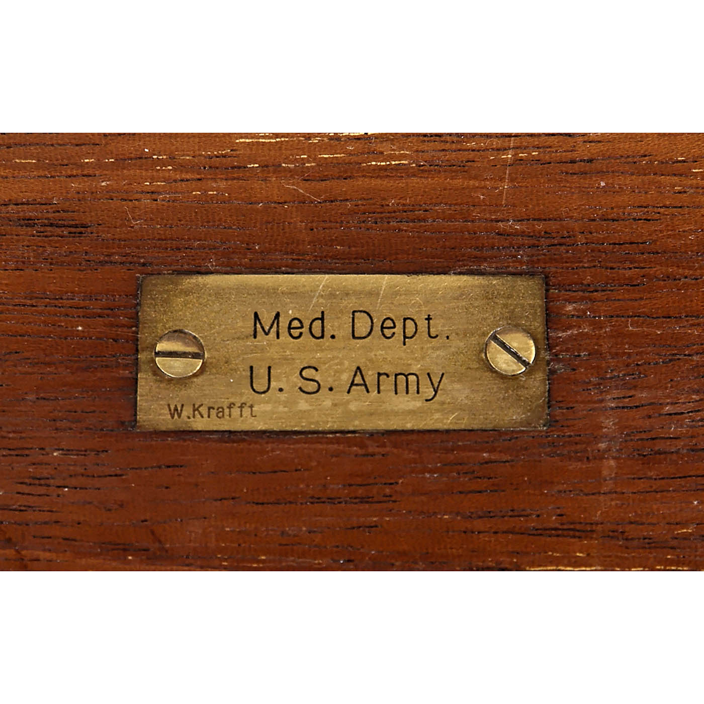 Ernst Leitz, Wetzlar, Germany. Serial no. 81750, polished and black-lacquered brass, height 11 in., foldable foot, double mirror, 90-degree angle pivotable stage, substage height-adjustable iris diaphragm and condenser, triple nosepiece, coarse and fine adjustment with knurled screws, with 2 eyepieces and 3 objectives in wood box, lid with "Med. Dept. U.S. Army" brass plaque. A flat foldable microscope, therefore it fits in a relatively small box. One objective mount missing.