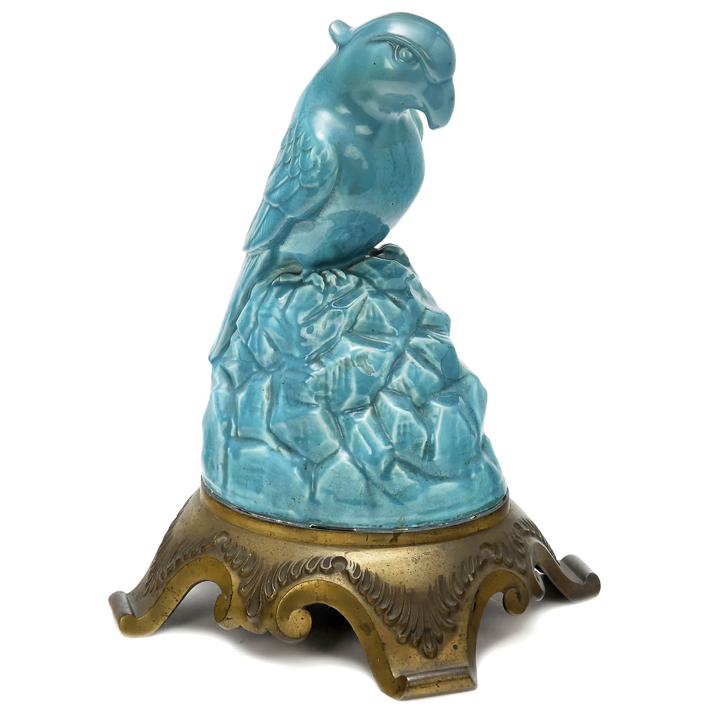 By Doulton & Co. for Artandia Ltd. Turquoise pottery parrot with Amplion speaker system, height 13 ¾ in.