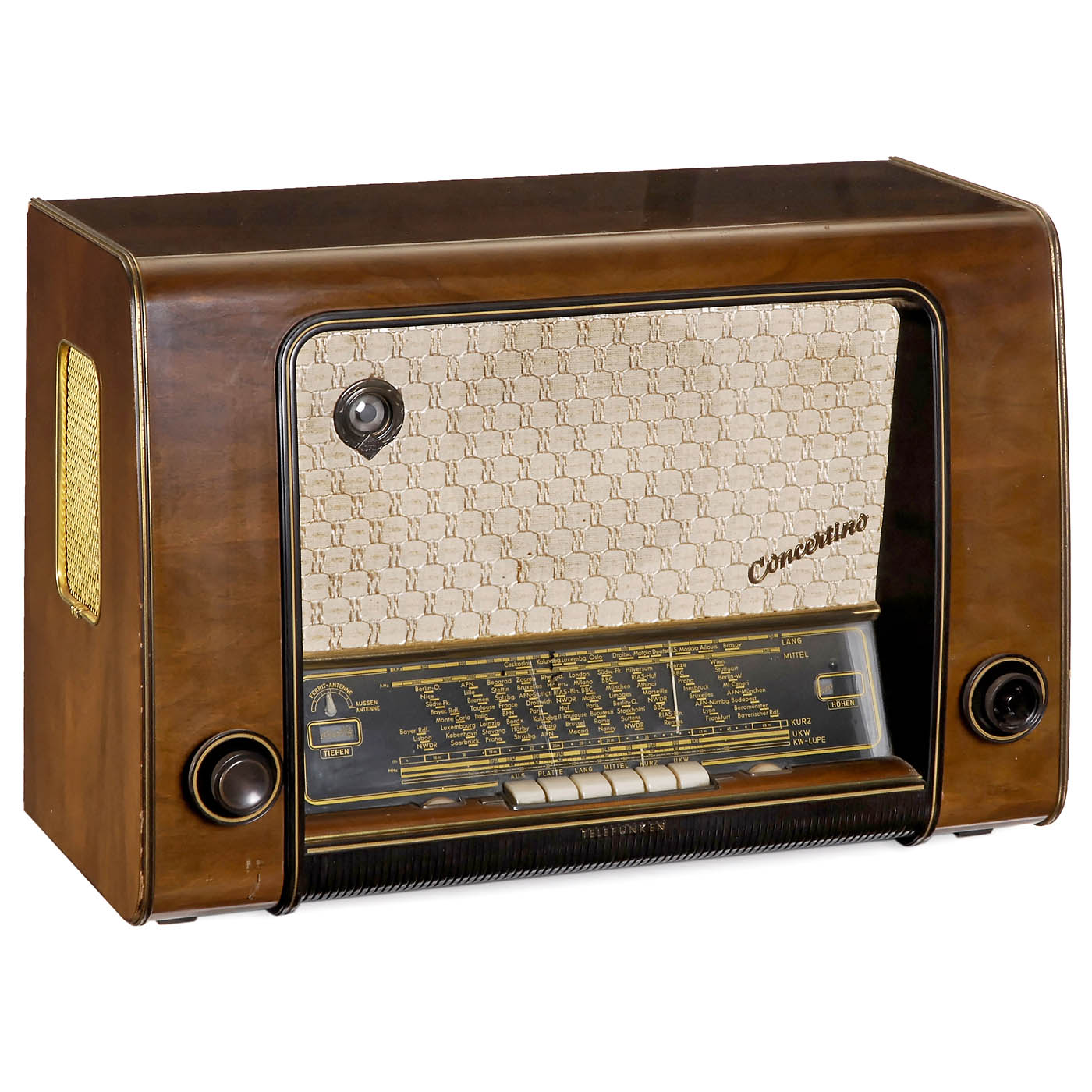 1) Telefunken Concertino 55, 7 tubes, 4 wave ranges, 1955. - 2) Philips BX 360A, 4 tubes, post-war low-cost radio, in the Netherlands known as "wailing wall", 1946. - 3) Philips 990X, 8 tubes, 2 loudspeakers, station keys, a deluxe Dutch model, 1940. - 4) Amroh MK4350, Dutch kit radio, 6 tubes, 1950. - 5) Fridor 524, Den Haag, 6 tubes, 1951. - And: 6) Erres KY457, Den Haag, 5 tubes, c. 1950.