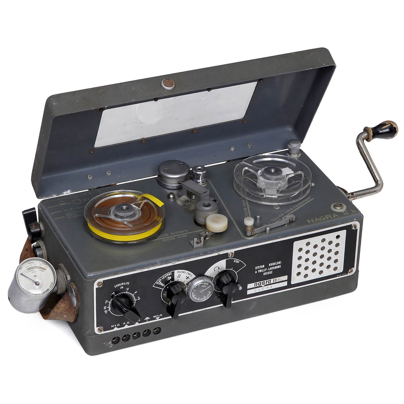 Kudelski, Switzerland. Crank-driven clockwork motor drive, tape speed 19,05 cm/s, playing 6 min., frequency 50 Hz to 12 kHz, with external modulometer, untested, very rare and sought-after!